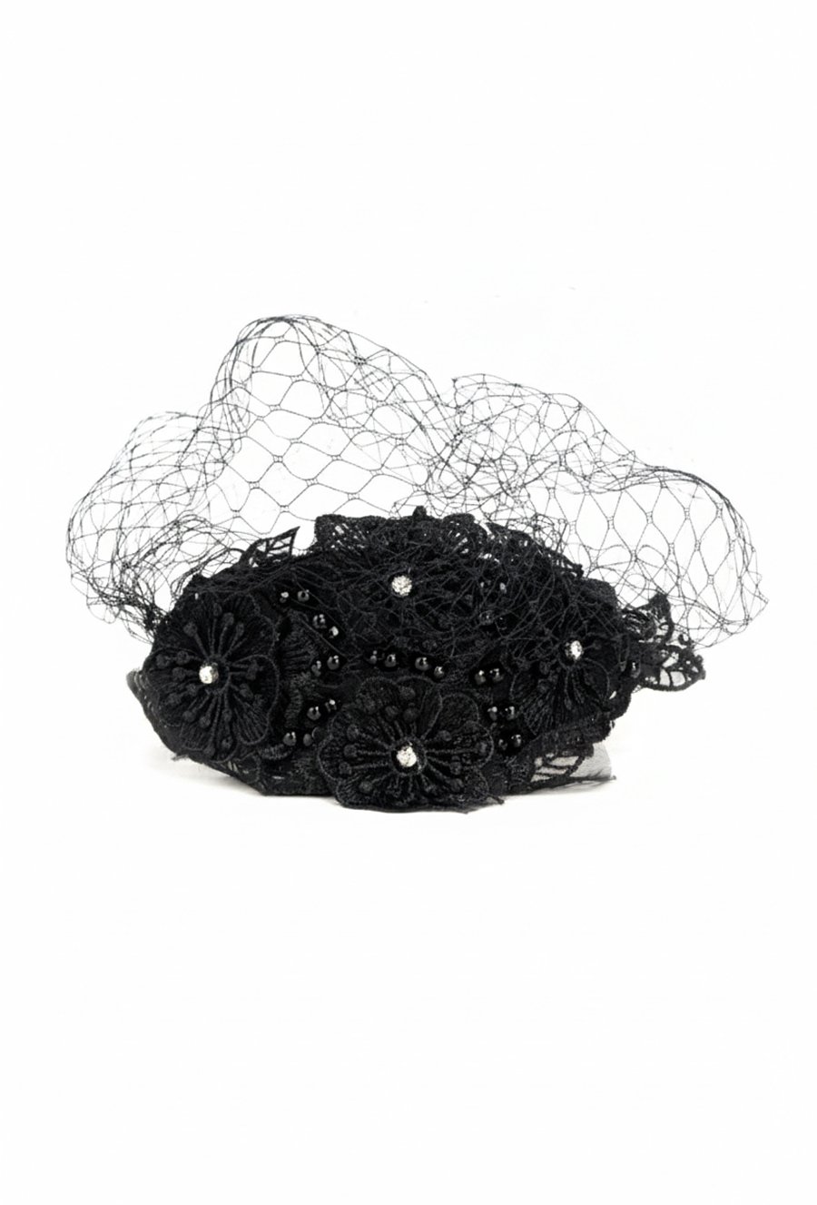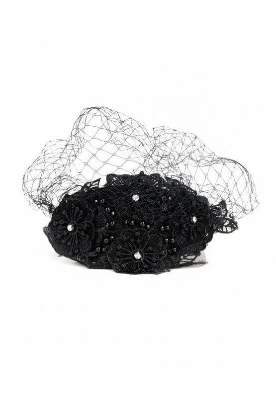 Opaska damska na głowę o eleganckim, dekoracyjnym charakterze. Model zdobiony efektowną aplikacją z kwiatowych elementów, koronkowych detali oraz subtelnych koralików. Całość uzupełnia delikatna siateczka, która nadaje stylizacji wyjątkowego, wieczorowego wyrazu.