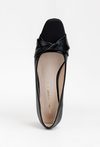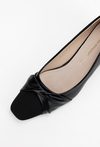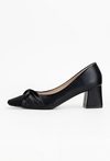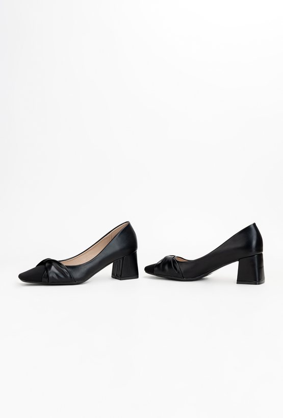 Eleganckie czółenka wykonane z wysokiej jakości skóry ekologicznej w kolorze czarnym. Model z lekko zaokrąglonym noskiem i ozdobnym wiązaniem, na stabilnym, kwadratowym obcasie. Skórzana wkładka zapewnia wysoki komfort przy chodzeniu