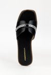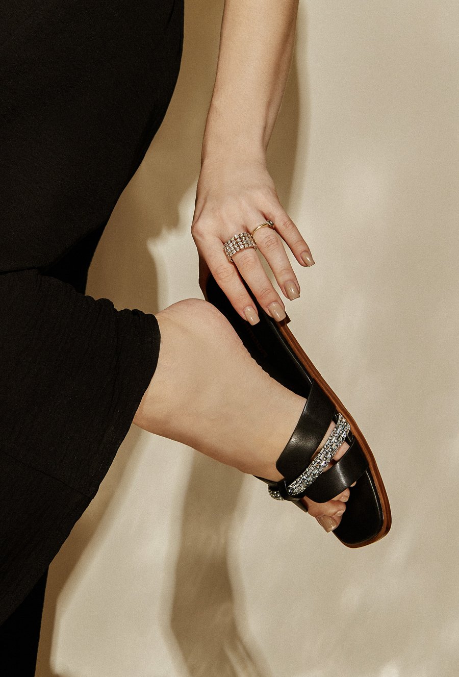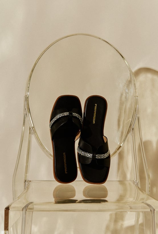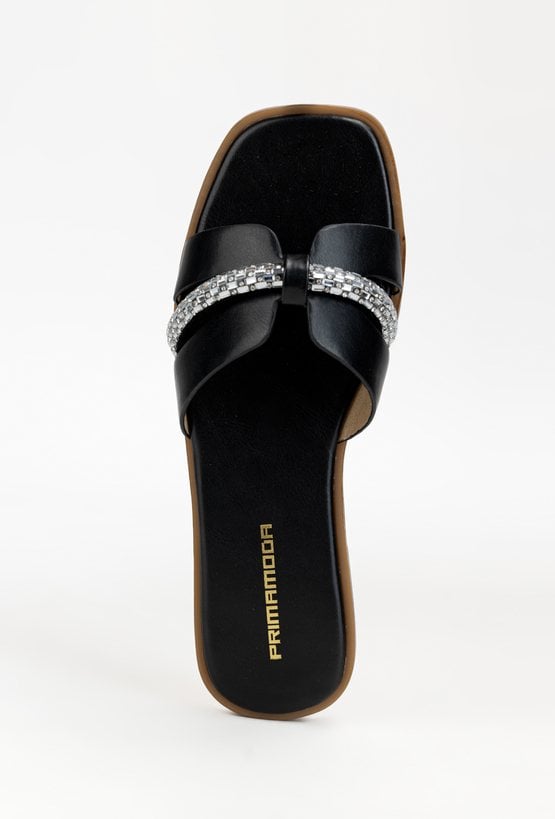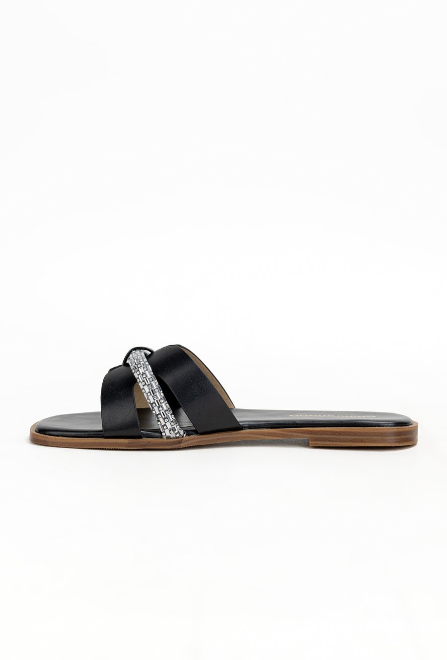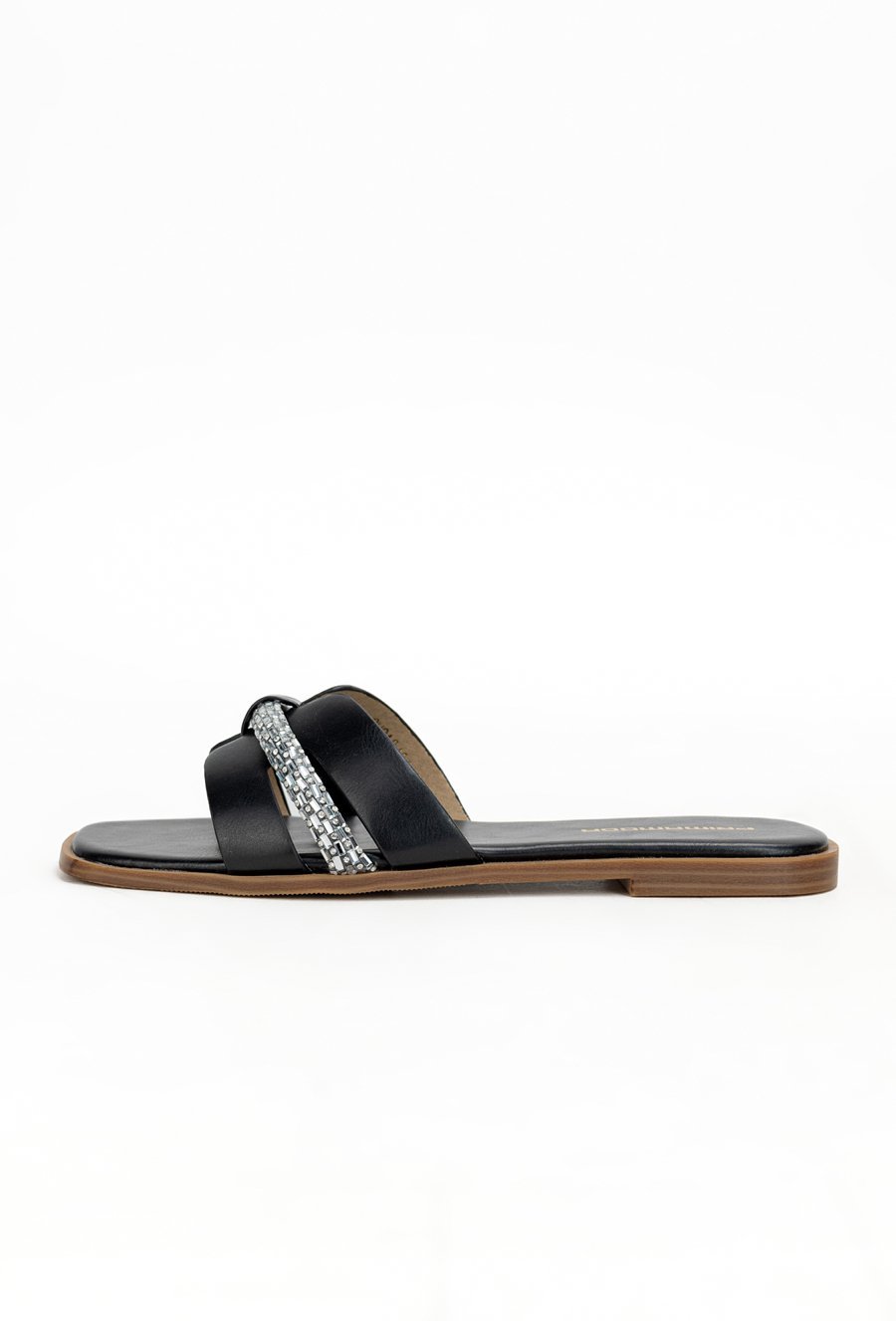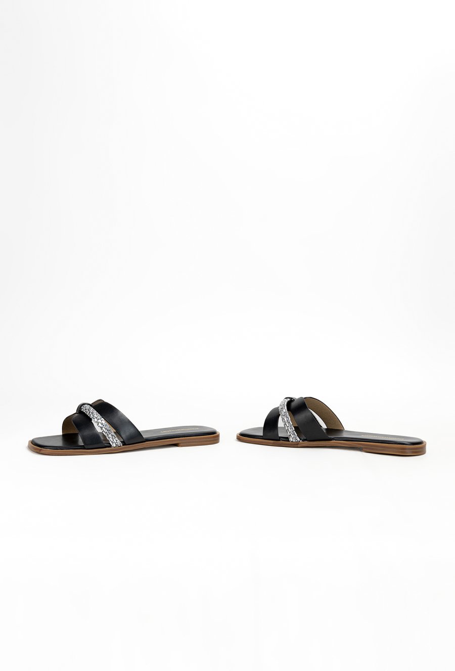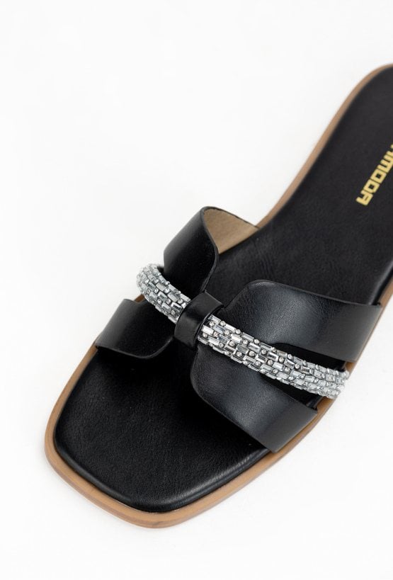 Czarne klapki wykonane z wysokiej jakości skóry ekologicznej. Model na płaskiej, miękkiej podeszwie z szerokim pasem ozdobionym cienkim paseczkiem i srebrnymi oczkami. Komfortowy fason, utrzymany w formacie stylowego minimalizmu.