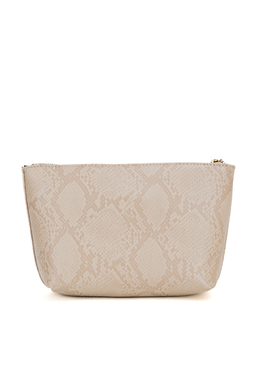 Kosmetyczka damska zdobiona eleganckim wzorem imitującym skórę krokodyla. Przód uzupełnia logowana blaszka z dekoracyjnym złotym chwostem, który dodaje całości wyjątkowego charakteru. Wnętrze wykończone ciemną, logowaną podszewką z kieszonkami na drobiazgi. Idealnie sprawdzi się na prezent jak i do codziennego użytkowania. Wymiary: 27 cm x 16, 5 cm 9 cm.