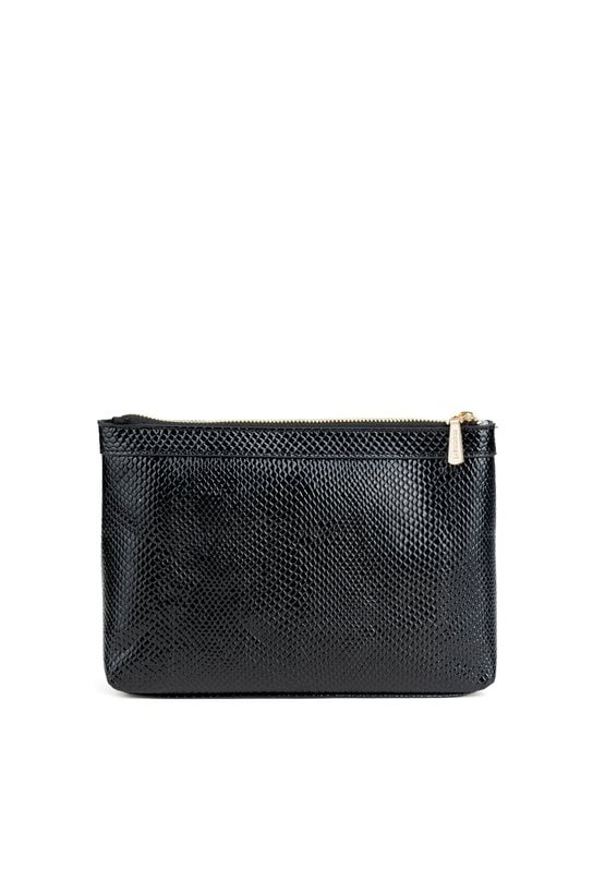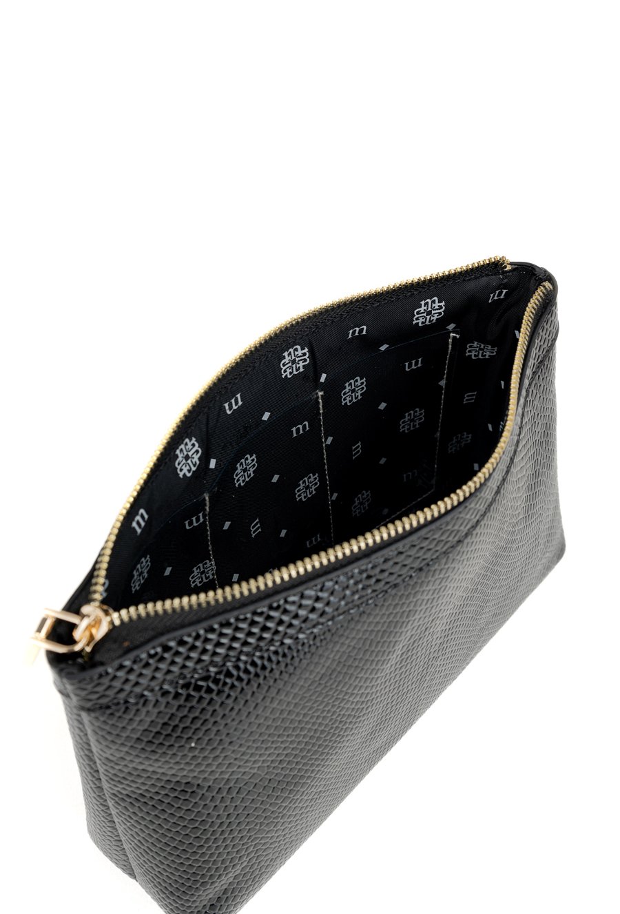 Kosmetyczka damska zdobiona subtelnym wzorem. Wnętrze wykończone ciemną, logowaną podszewką z dodatkowymi kieszonkami, które ułatwiają przechowywanie drobiazgów. Doskonała zarówno do codziennego użytku, jak i jako elegancki prezent. Wymiary: 26,5 × 17,5 × 7 cm.