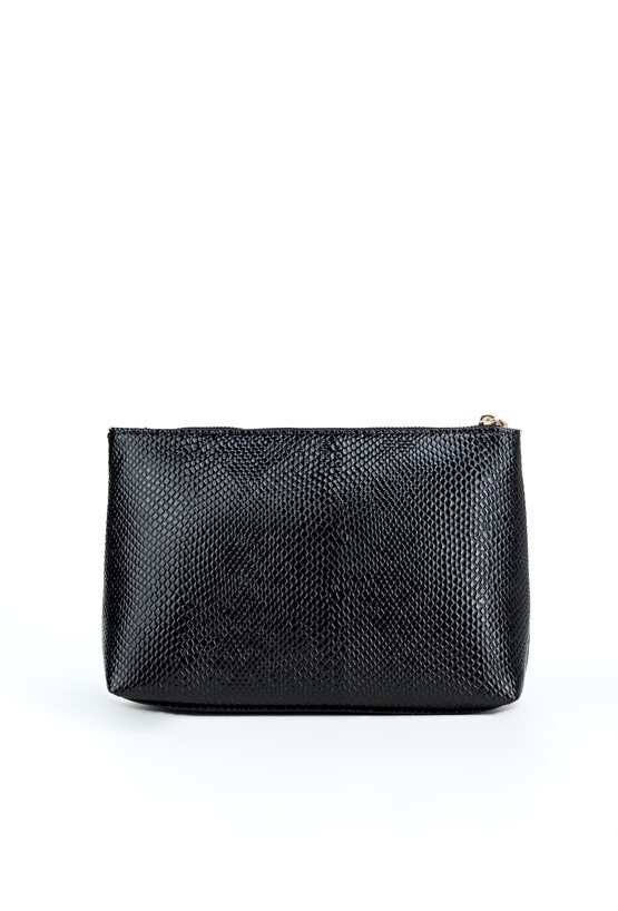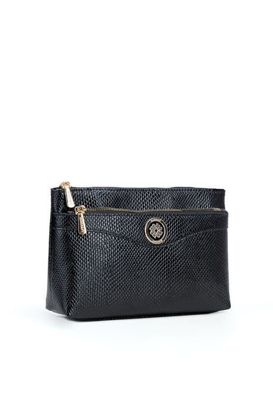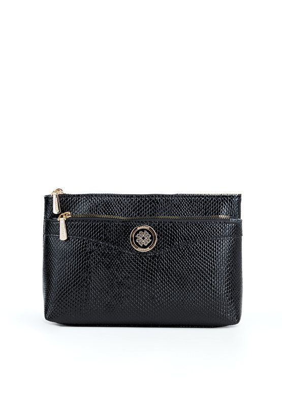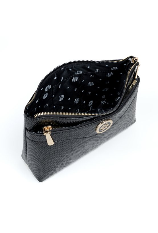 Kosmetyczka damska z praktyczną kieszonką z przodu. Jednokomorowy model z ciemnym, logowanym wnętrzem zapewnia wygodną organizację drobiazgów. Doskonała zarówno do codziennego użytku, jak i jako elegancki prezent. Wymiary: 27 cm x 18 cm x 7 cm.