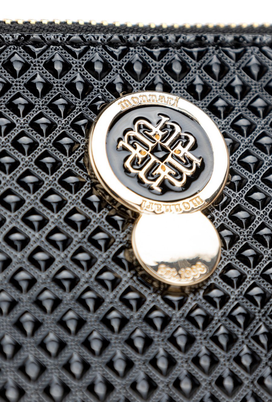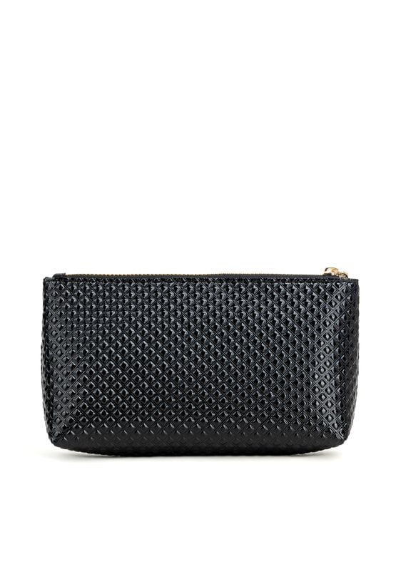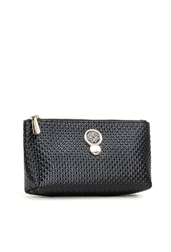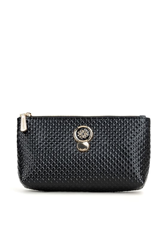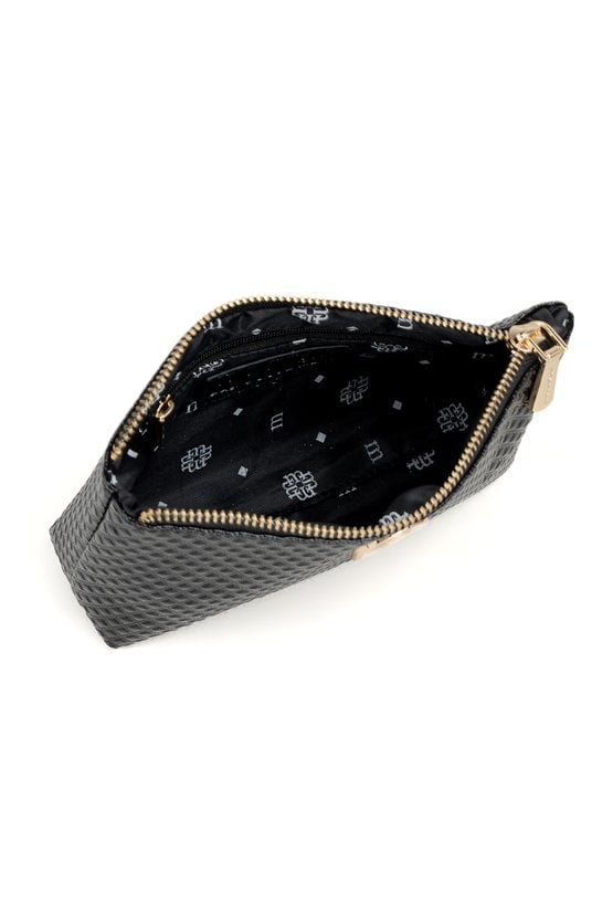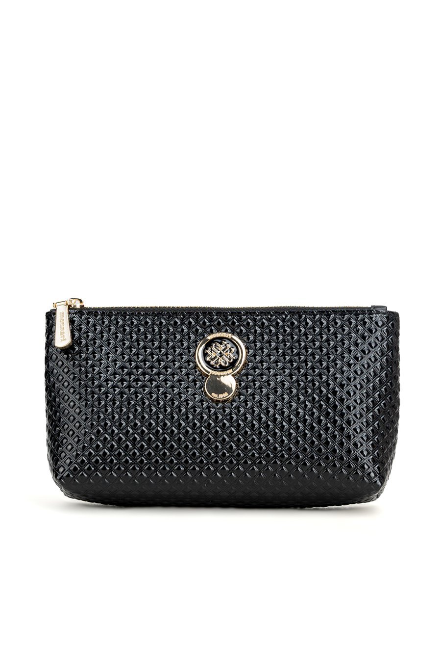 Mała kosmetyczka damska o wymiarach 20 × 11 × 4 cm, wygodna do noszenia w dłoni. Wnętrze wykończone ciemną, logowaną podszewką z praktycznymi kieszonkami na drobiazgi. Doskonała do codziennego użytku, a także jako stylowy prezent.