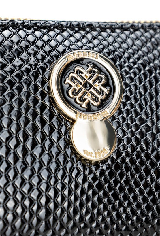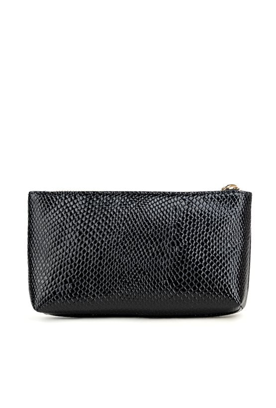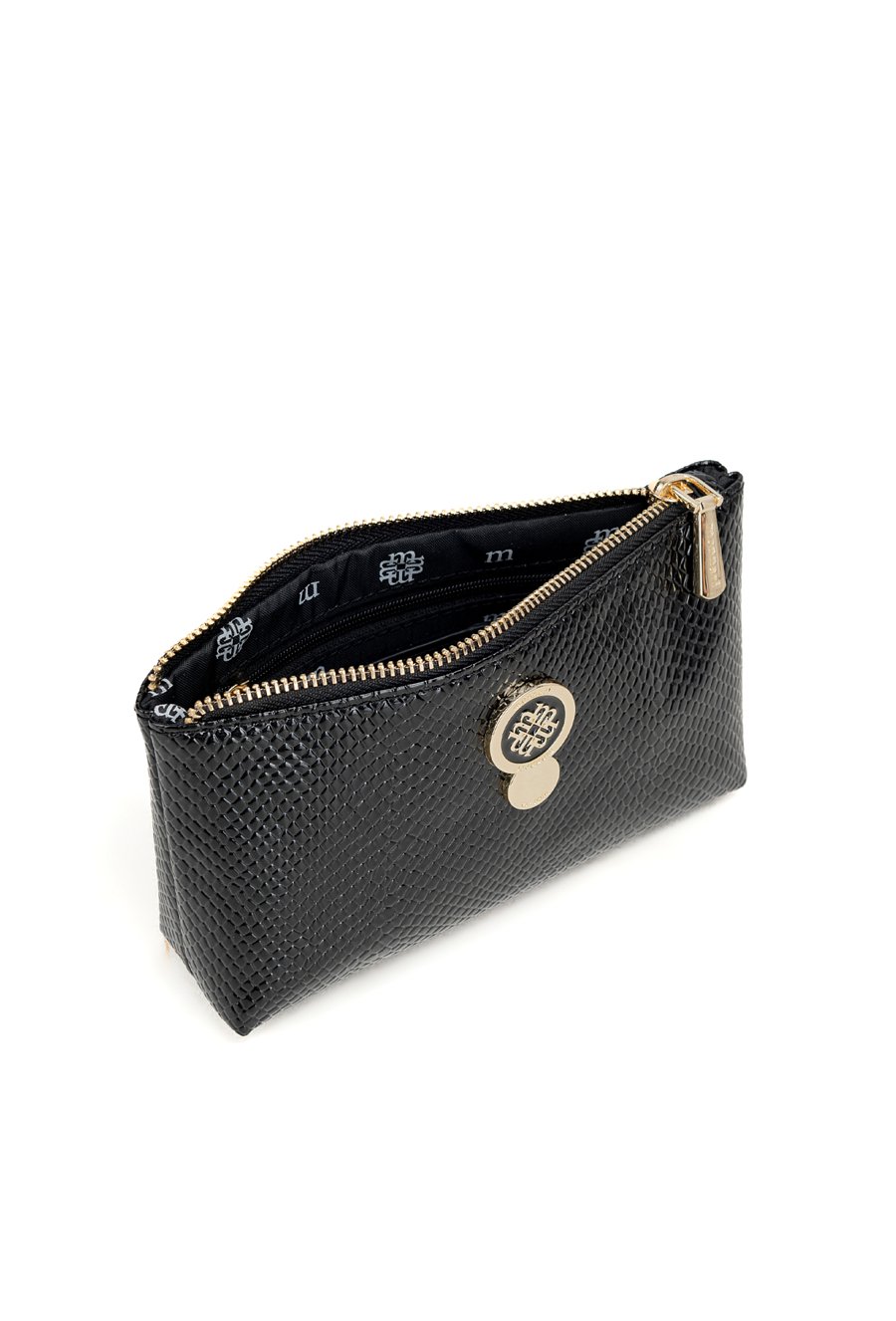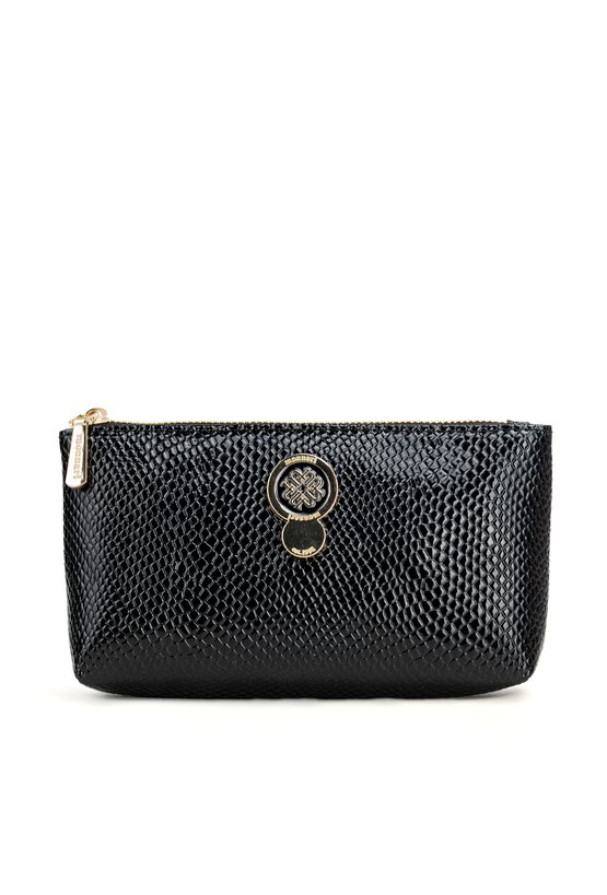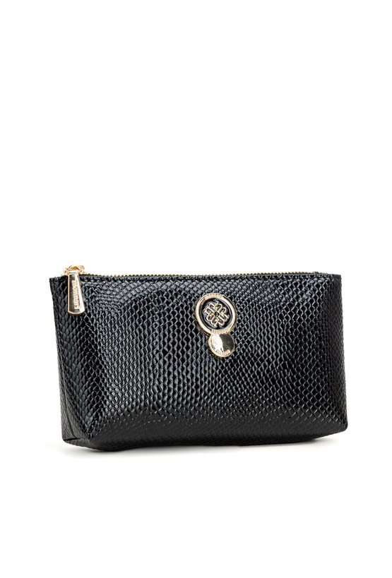 Mała kosmetyczka damska o wymiarach 20 × 11 × 4 cm, wygodna do noszenia w dłoni. Wnętrze wykończone ciemną, logowaną podszewką z praktycznymi kieszonkami na drobiazgi. Doskonała do codziennego użytku, a także jako stylowy prezent.