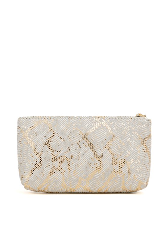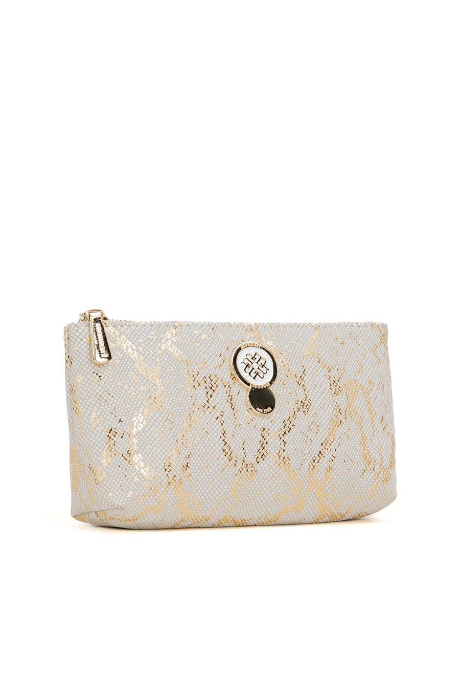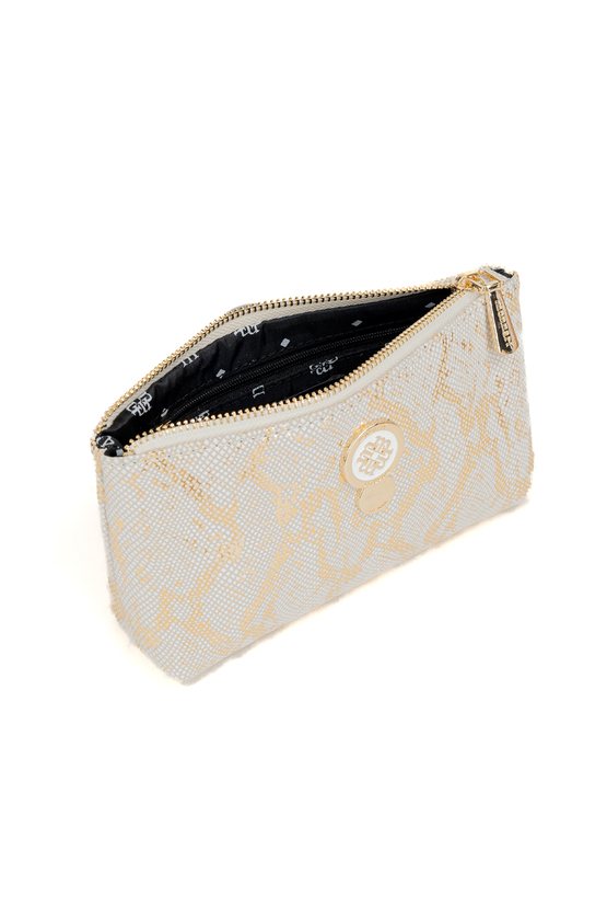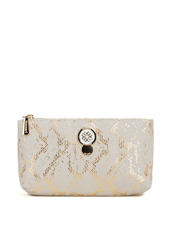 Mała kosmetyczka damska o wymiarach 20 × 11 × 4 cm, wygodna do noszenia w dłoni. Wnętrze wykończone ciemną, logowaną podszewką z praktycznymi kieszonkami na drobiazgi. Doskonała do codziennego użytku, a także jako stylowy prezent.