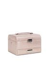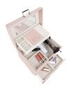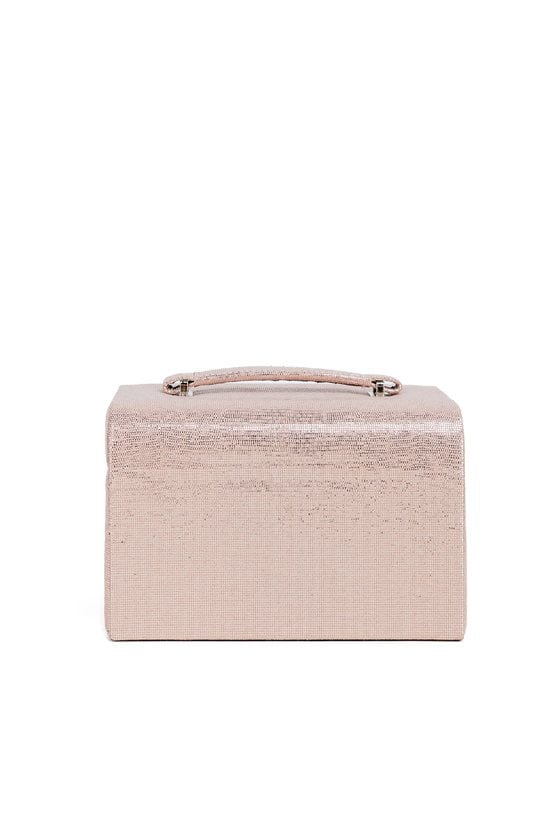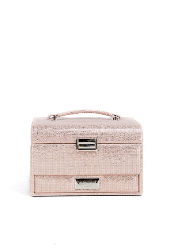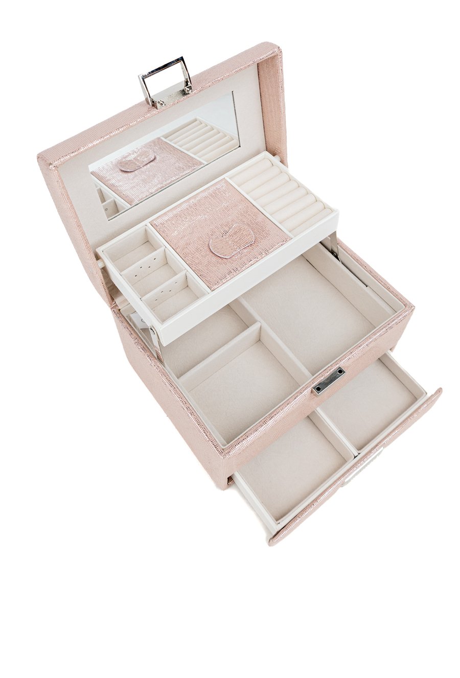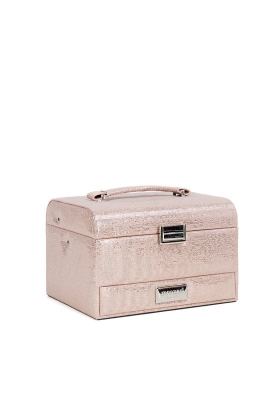 Elegancki kuferek na biżuterię lub kosmetyki, zawieszony na praktycznej, krótkiej rączce, świetnie sprawdzi się zarówno w podróży, jak i jako stylowy prezent. Liczne przegródki umożliwiają bezpieczne i uporządkowane przechowywanie wszystkich akcesoriów. Wnętrze kuferka wzbogacono o lusterko, które ułatwia szybkie poprawki makijażu oraz dobór biżuterii. Wymiary: 20 cm x 13 cm x 15,5 cm.