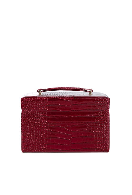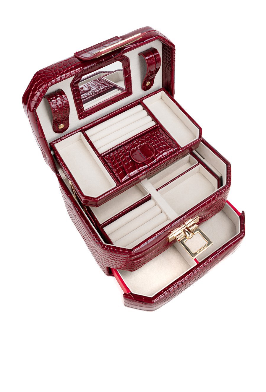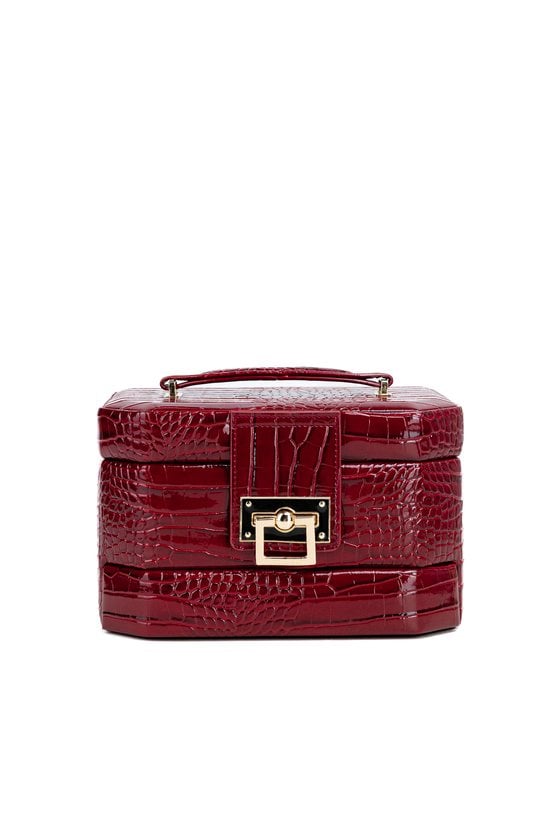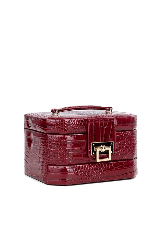 Elegancki kuferek na biżuterię lub kosmetyki z praktyczną, krótką rączką to idealny wybór zarówno w podróży, jak i jako stylowy prezent. Liczne przegródki umożliwiają bezpieczne przechowywanie wszystkich elementów biżuterii – od bransoletek, pierścionków i kolczyków po naszyjniki – zapewniając im doskonałą organizację. Wnętrze kuferka wzbogacono o lusterko, które ułatwia szybkie poprawki makijażu i dobór odpowiednich akcesoriów. Wymiary: 26 cm x 13,5 cm x 17 cm.