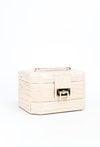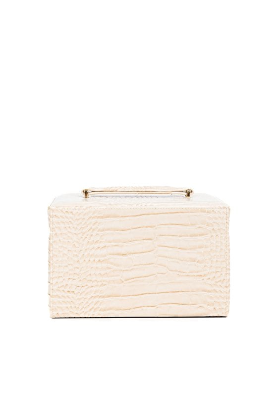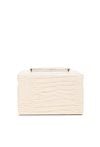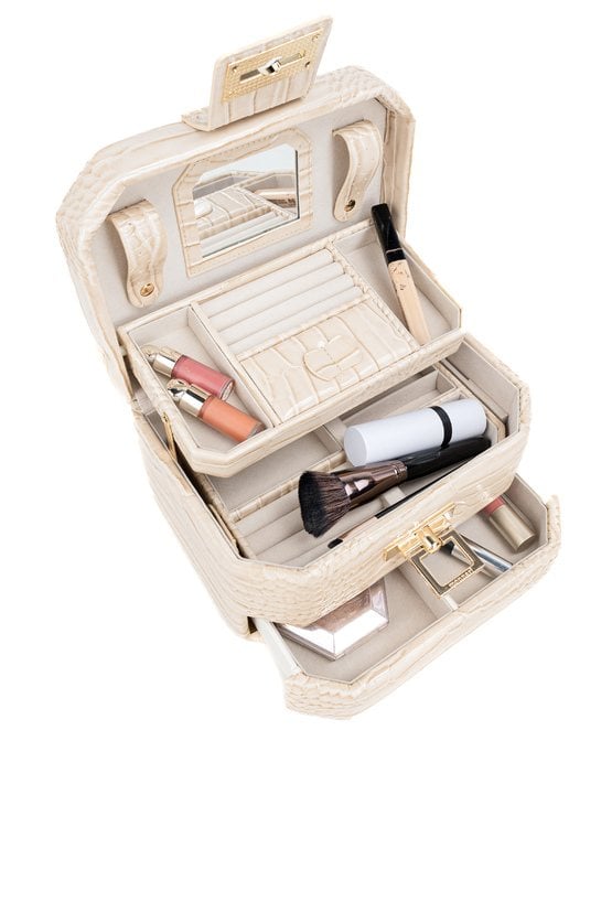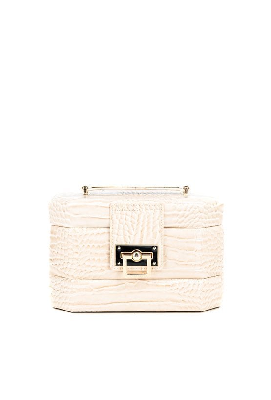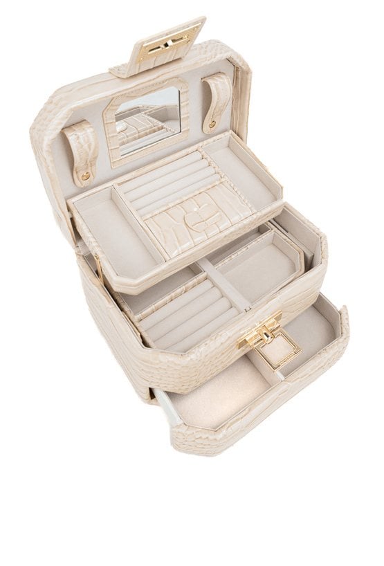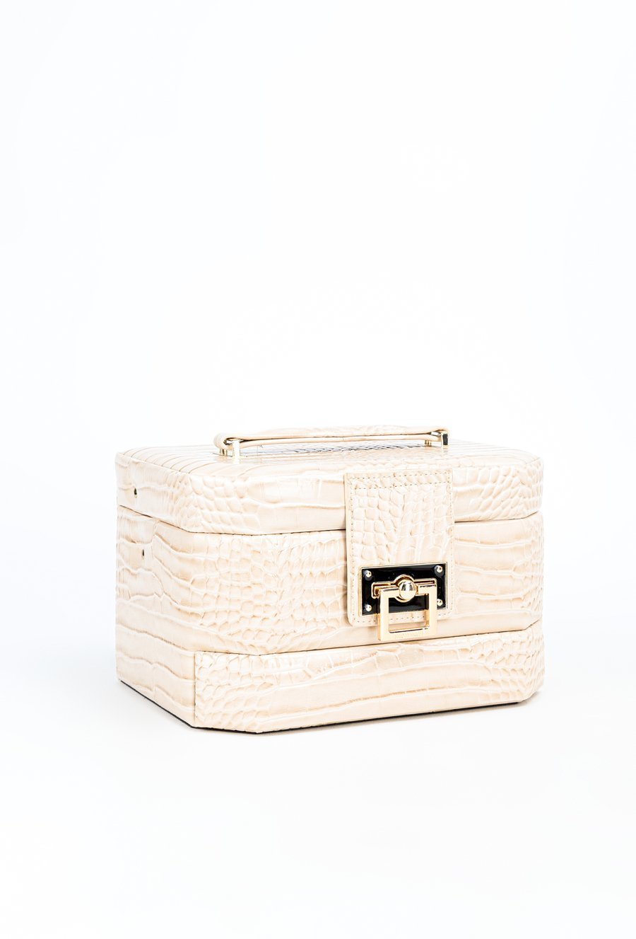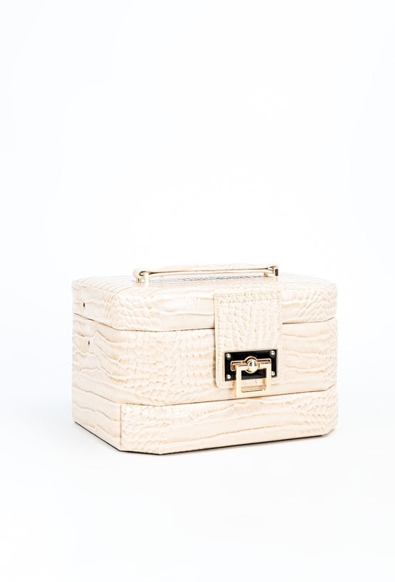 Elegancki kuferek na biżuterię lub kosmetyki z praktyczną, krótką rączką to idealny wybór zarówno w podróży, jak i jako stylowy prezent. Liczne przegródki umożliwiają bezpieczne przechowywanie wszystkich elementów biżuterii – od bransoletek, pierścionków i kolczyków po naszyjniki – zapewniając im doskonałą organizację. Wnętrze kuferka wzbogacono o lusterko, które ułatwia szybkie poprawki makijażu i dobór odpowiednich akcesoriów. Wymiary: 26 cm x 13,5 cm x 17 cm.
