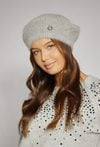Czapka damska typu beret o miękkiej, puszystej fakturze z delikatnym połyskiem. Utrzymana w stonowanym kolorze, ozdobiona metalowym emblematem z logo, który dodaje całości elegancji. Klasyczny i kobiecy model, idealny do zimowych stylizacji w szykownym wydaniu.