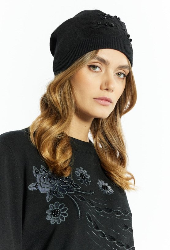 Klasyczna czapka damska z ozdobnymi koralikami. Model ten świetnie sprawdzi się na chłodne dni.