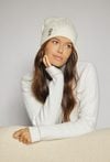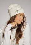 Stylowa czapka ozdobiona subtelnym wzorem z błyszczących aplikacji i elegancką broszką z kryształkami.