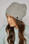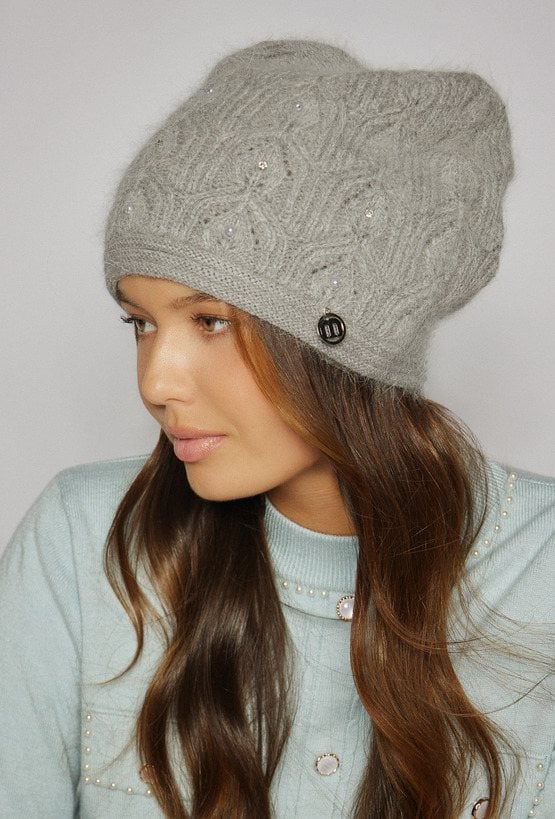 Czapka damska o dekoracyjnym, ażurowym splocie, ozdobiona subtelnymi dżetami i koralikami. Delikatne zdobienia dodają całości elegancji i kobiecego uroku. Miękka faktura i klasyczny fason sprawiają, że model doskonale uzupełni zimowe stylizacje, łącząc styl z wygodą.