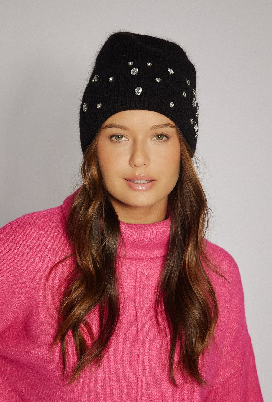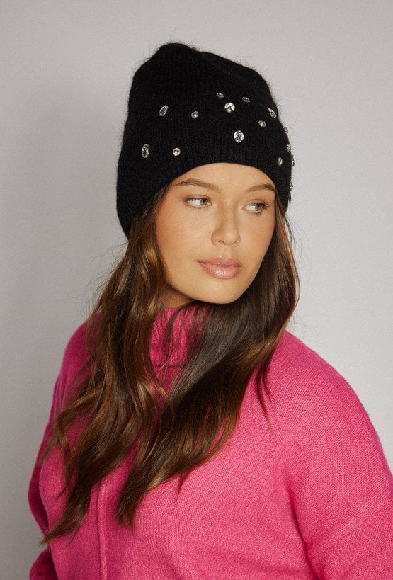 Czapka damska ozdobiona aplikacją z większych i mniejszych dżetów, rozmieszczonych wokół obwodu. Lśniące elementy przyciągają wzrok i dodają całości eleganckiego, kobiecego charakteru.