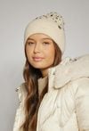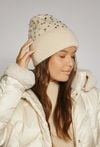 Kremowa czapka o klasycznym fasonie, ozdobiona błyszczącymi aplikacjami. Czapka o wyraźnym, prążkowanym ściągaczu, zapewnia komfort i elegancki wygląd w chłodne dni.