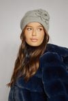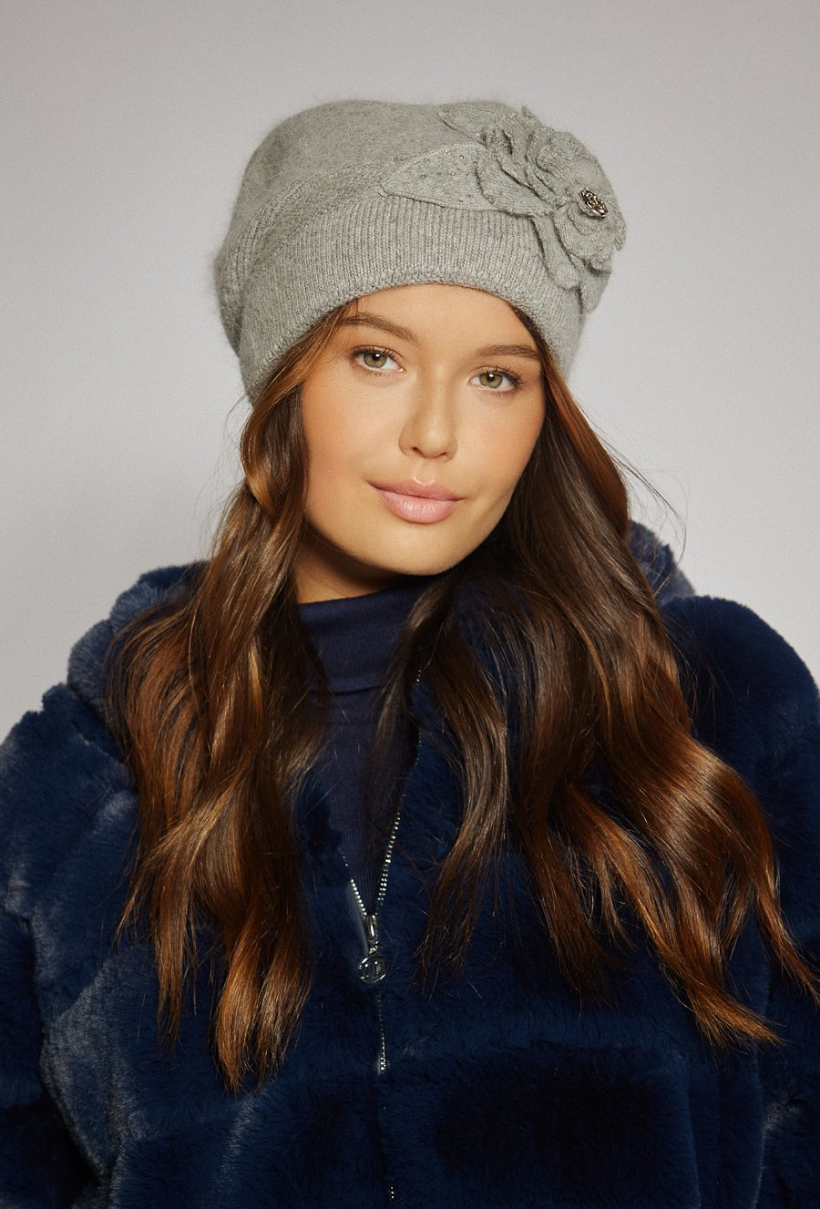 Czapka damska ozdobiona aplikacją w formie materiałowego kwiatu. Subtelny, trójwymiarowy detal nadaje całości elegancki i kobiecy charakter. Klasyczny fason w stonowanym kolorze sprawia, że model doskonale uzupełni zarówno codzienne, jak i bardziej wyrafinowane zimowe stylizacje.