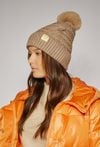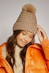 Czapka damska o klasycznym splocie warkoczowym, zwieńczona miękkim, puszystym pomponem. Stylowy model w ciepłym, neutralnym odcieniu doskonale wpisuje się w zimowe stylizacje.