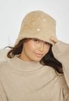 Czapka damska o miękkiej, puszystej fakturze. Ozdobiona subtelnymi aplikacjami w formie połyskujących detali oraz elegancką zawieszką, stanowi modny i wyróżniający się element zimowych stylizacji.