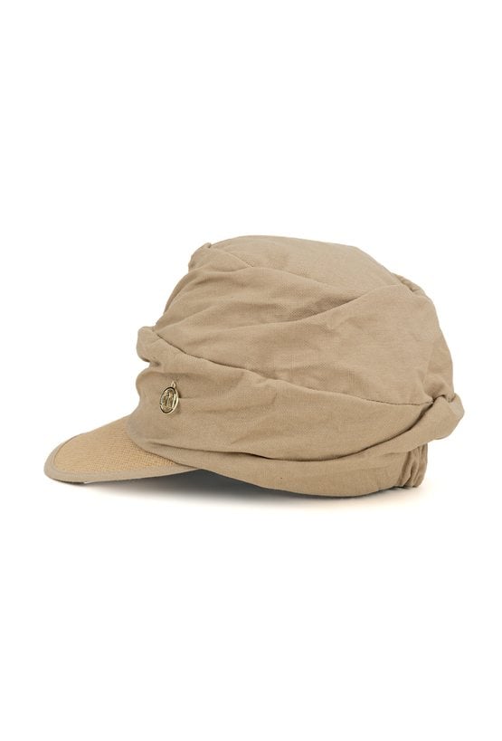 Czapka z daszkiem o miękkim, marszczonym fasonie. Model z delikatnie uformowanym daszkiem oraz dekoracyjnymi przeszyciami, które nadają całości kobiecego i eleganckiego charakteru.
