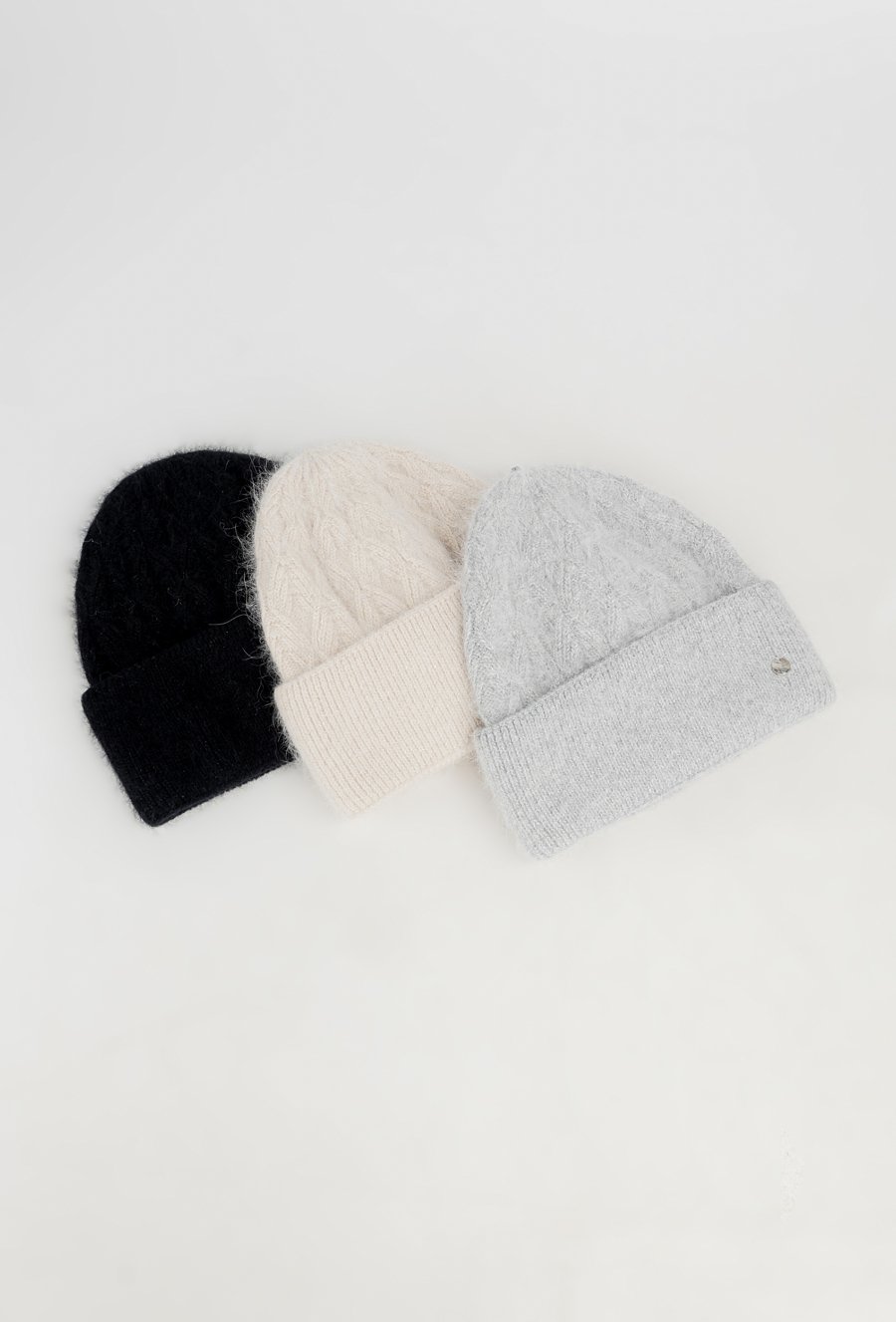 Czarna czapka ze ściągaczem jest wykonana z wysokogatunkowej angory z dodatkiem kaszmiru. Czapka pięknie będzie się prezentował przy twarzy. Miękka i przyjemna w dotyku dzianina doskonale dostosowuje się do kształtu głowy.