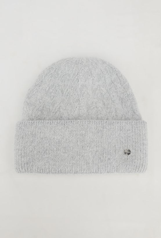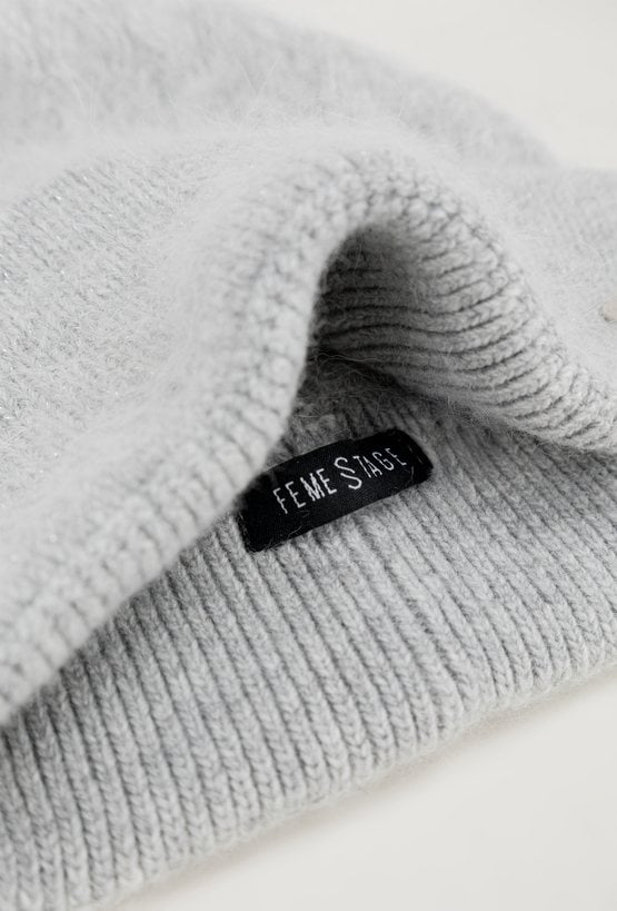 Szara czapka ze ściągaczem jest wykonana z wysokogatunkowej angory z dodatkiem kaszmiru. Czapka pięknie będzie się prezentował przy twarzy. Miękka i przyjemna w dotyku dzianina doskonale dostosowuje się do kształtu głowy.