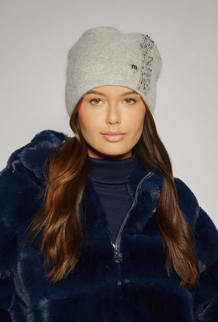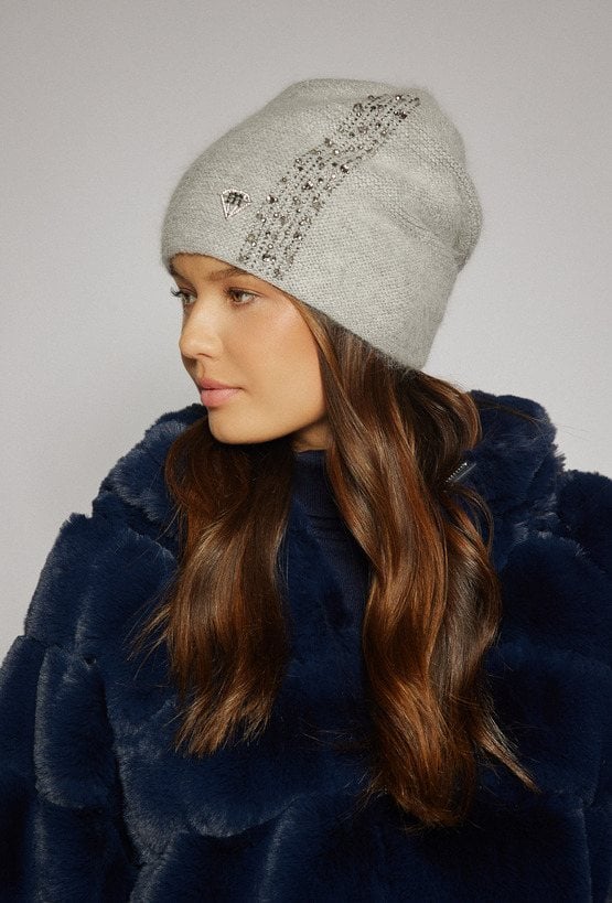 Czapka damska ozdobiona aplikacją z drobnych dżetów i koralików, tworzącą elegancki, diagonalny wzór. Subtelny połysk dekoracji dodaje całości szykownego charakteru.