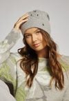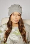 Czapka damska ozdobiona aplikacją z dżetów i koralików, tworzącą subtelny motyw z przodu. Błyszczące detale nadają całości elegancji i kobiecego uroku. Klasyczny fason w jasnoszarym kolorze sprawia, że model doskonale uzupełni zimowe stylizacje, dodając im delikatnego blasku.