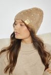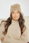 Czapka damska o miękkiej, futrzanej fakturze, ozdobiona dekoracyjnymi koralikami w perłowym wykończeniu. Subtelne zdobienia nadają całości elegancki i kobiecy charakter. Stylowy model w ciepłym, neutralnym kolorze doskonale uzupełni zimowe stylizacje, łącząc szyk z komfortem noszenia.
