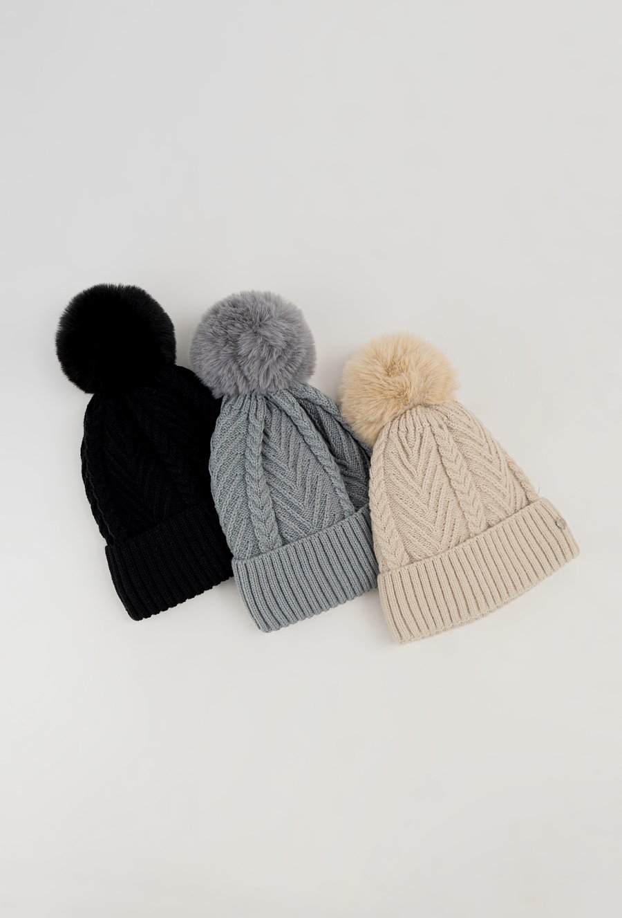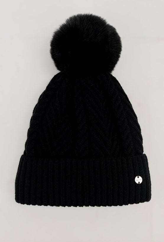 Stylowa, czarna czapka o grubym, modnym splocie to must-have na chłodne dni! Wnętrze wykończone mięciutkim, ciepłym „misiem” zapewni maksymalny komfort nawet podczas największych mrozów. Całość dopełnia uroczy pompon w tym samym kolorze, który dodaje lekkości i dziewczęcego uroku. Ten model nie tylko świetnie grzeje, ale też pięknie podkreśla rysy twarzy — idealny wybór na zimowy sezon!