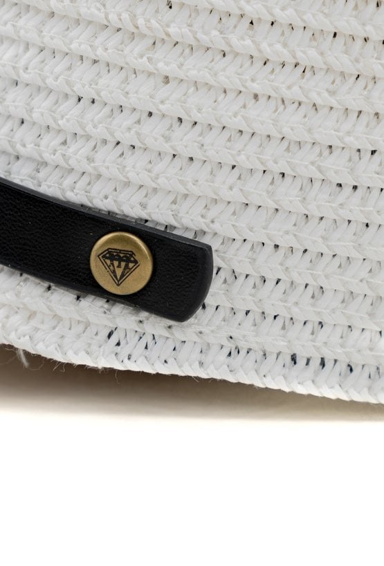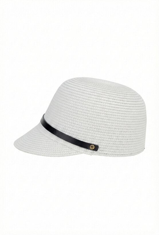 Pleciona czapka w jasnym kolorze, z krótkim daszkiem i dekoracyjnym paskiem. Lekka, wygodna i przewiewna.