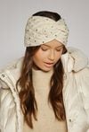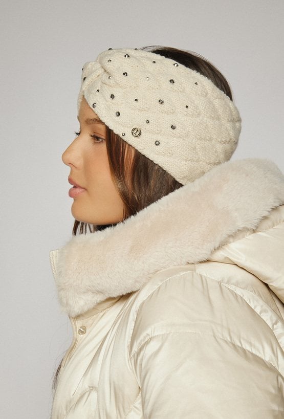 Opaska damska na głowę o efektownym, skręconym kroju z przodu. Ozdobiona drobnymi, błyszczącymi dżetami, które dodają całości elegancji i subtelnego blasku.