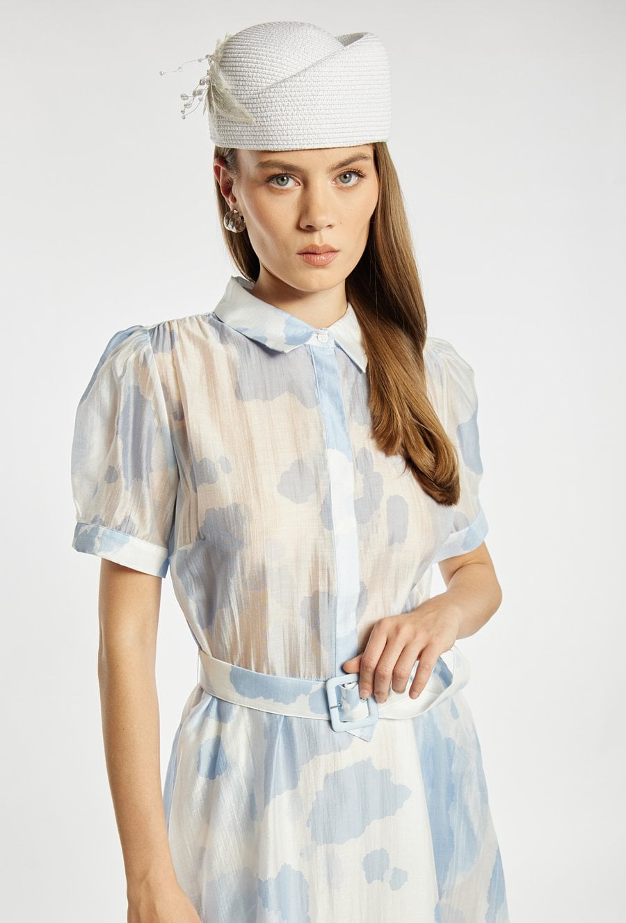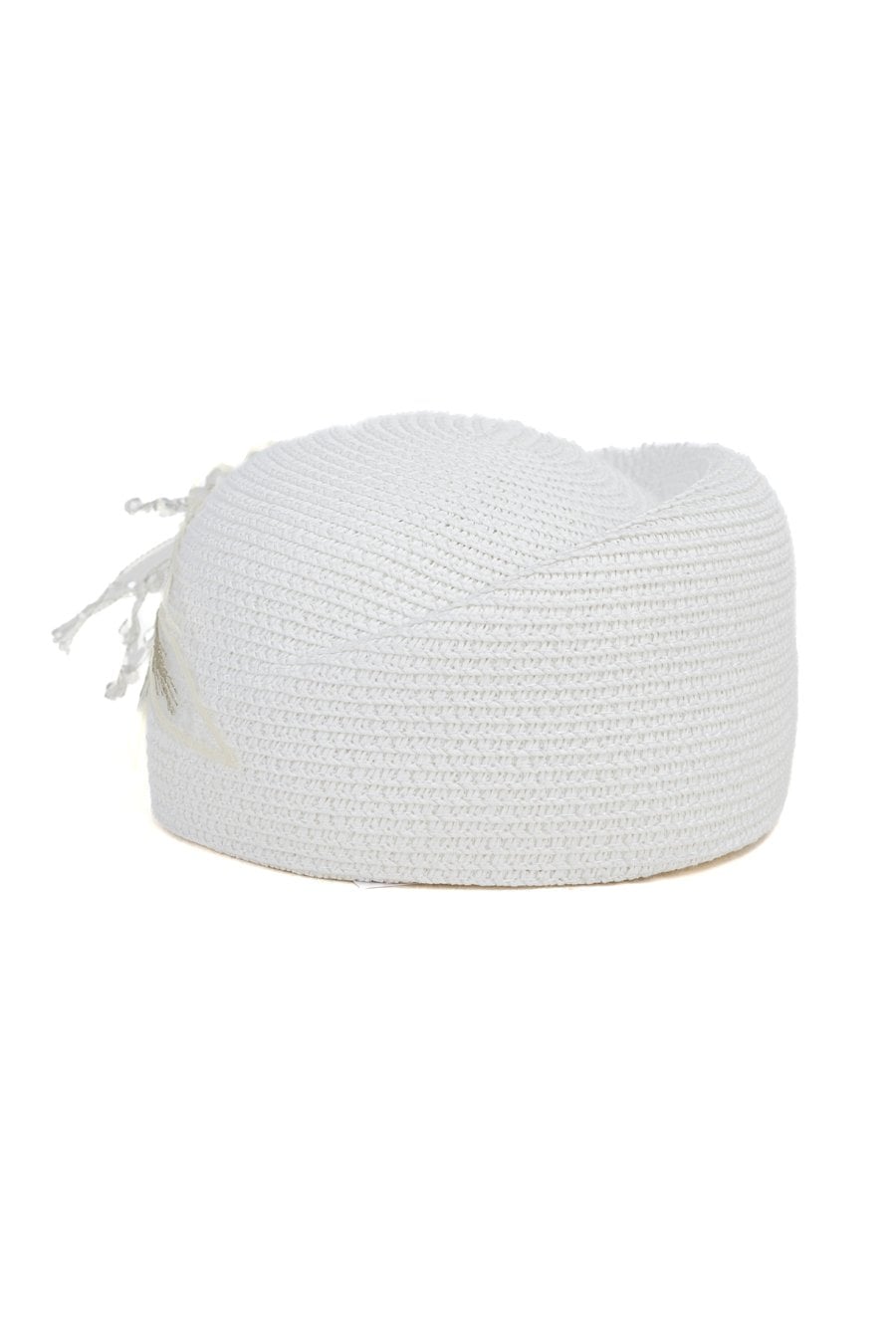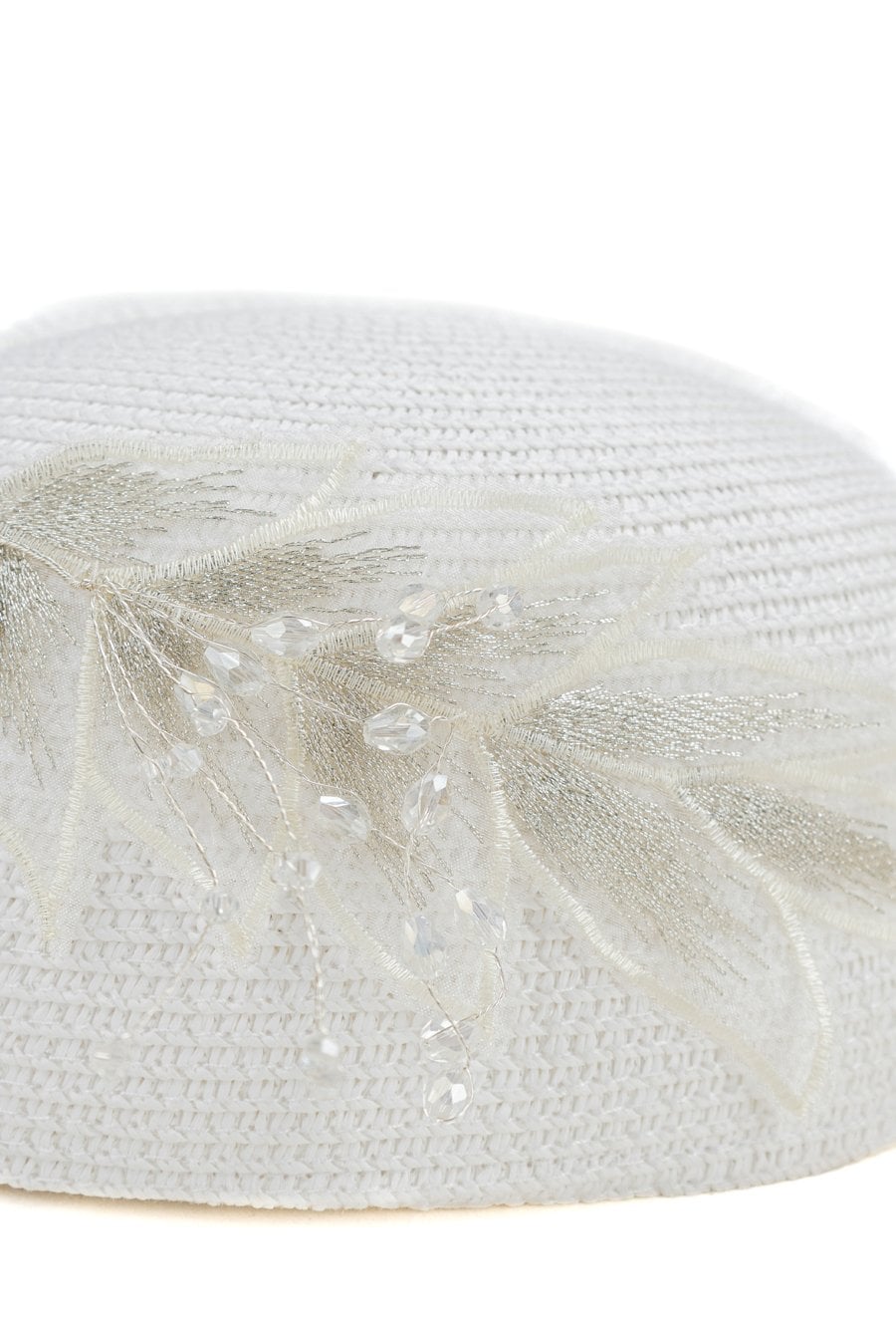 Pleciony toczek w jasnym kolorze. Ozdobiony subtelną aplikacją z koralików i delikatnej siateczki, która dodaje całości eleganckiego, biżuteryjnego charakteru. Lekki i dekoracyjny, idealny jako uzupełnienie letnich i okazjonalnych stylizacji.