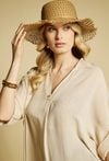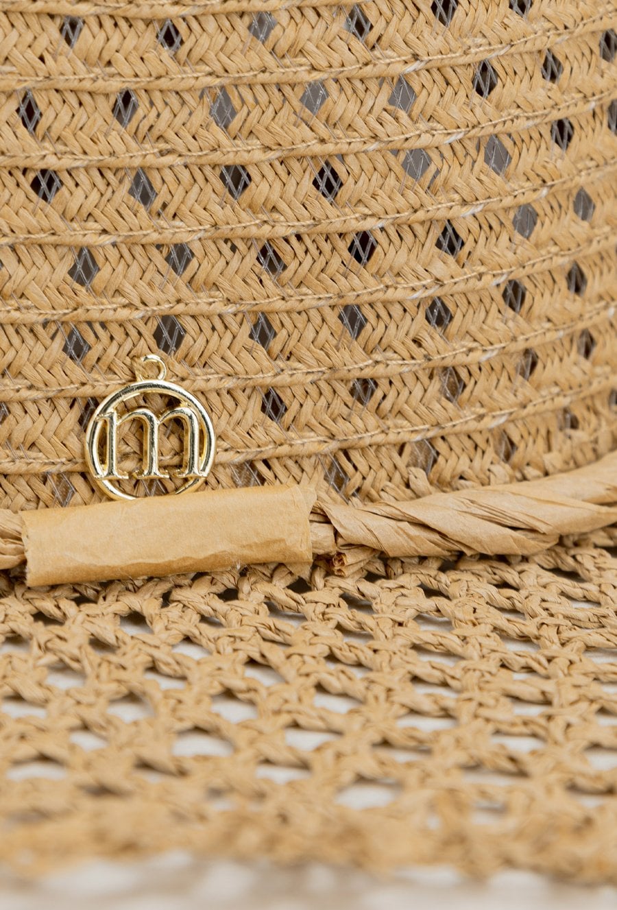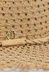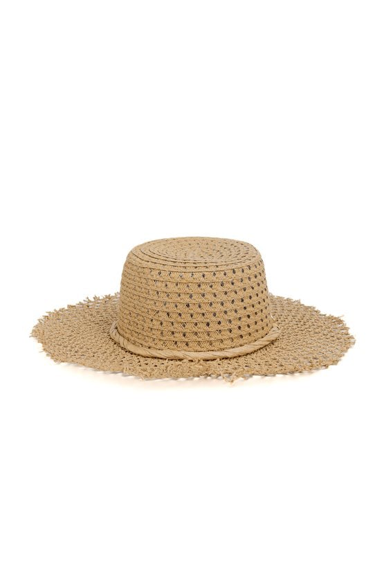 Kapelusz damski o lekkim, letnim fasonie. Model z prostą główką oraz szerokim rondem z delikatnym, ażurowym splotem, który zapewnia przewiewność i komfort noszenia. Ozdobny, pleciony pasek wokół korony podkreśla naturalny charakter dodatku.