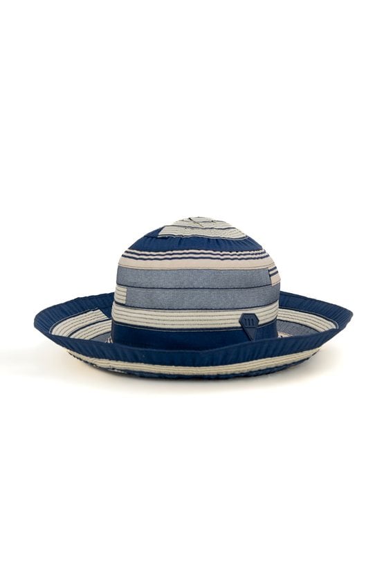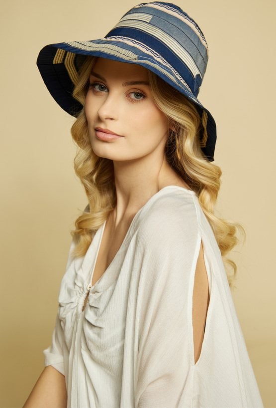 Kapelusz damski o letnim, casualowym charakterze. Model z szerokim rondem oraz profilowaną główką, zapewniającą wygodne dopasowanie. Całość zdobią poziome pasy o zróżnicowanej szerokości, które nadają kapeluszowi modnego i oryginalnego wyglądu.
