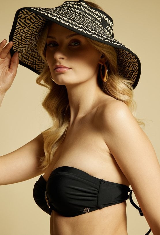 Stylowy kapelusz damski typu visor o szerokim rondzie. Model z efektownym wzorem oraz wiązaniem z tyłu, które umożliwia dopasowanie do głowy. Kapelusz doskonale chroni przed słońcem i świetnie sprawdzi się w letnich stylizacjach, na plaży oraz podczas wakacyjnych wyjazdów.