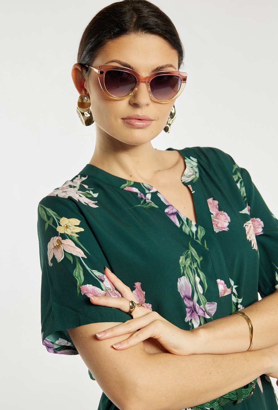 Okulary przeciwsłoneczne damskie o eleganckim, kobiecym fasonie. Model z delikatnie zaokrąglonymi oprawkami oraz przyciemnianymi soczewkami, które skutecznie chronią oczy przed promieniowaniem słonecznym. Smukłe zauszniki i staranne wykończenie nadają całości stylowego charakteru.
