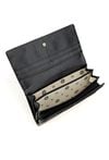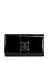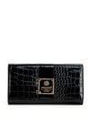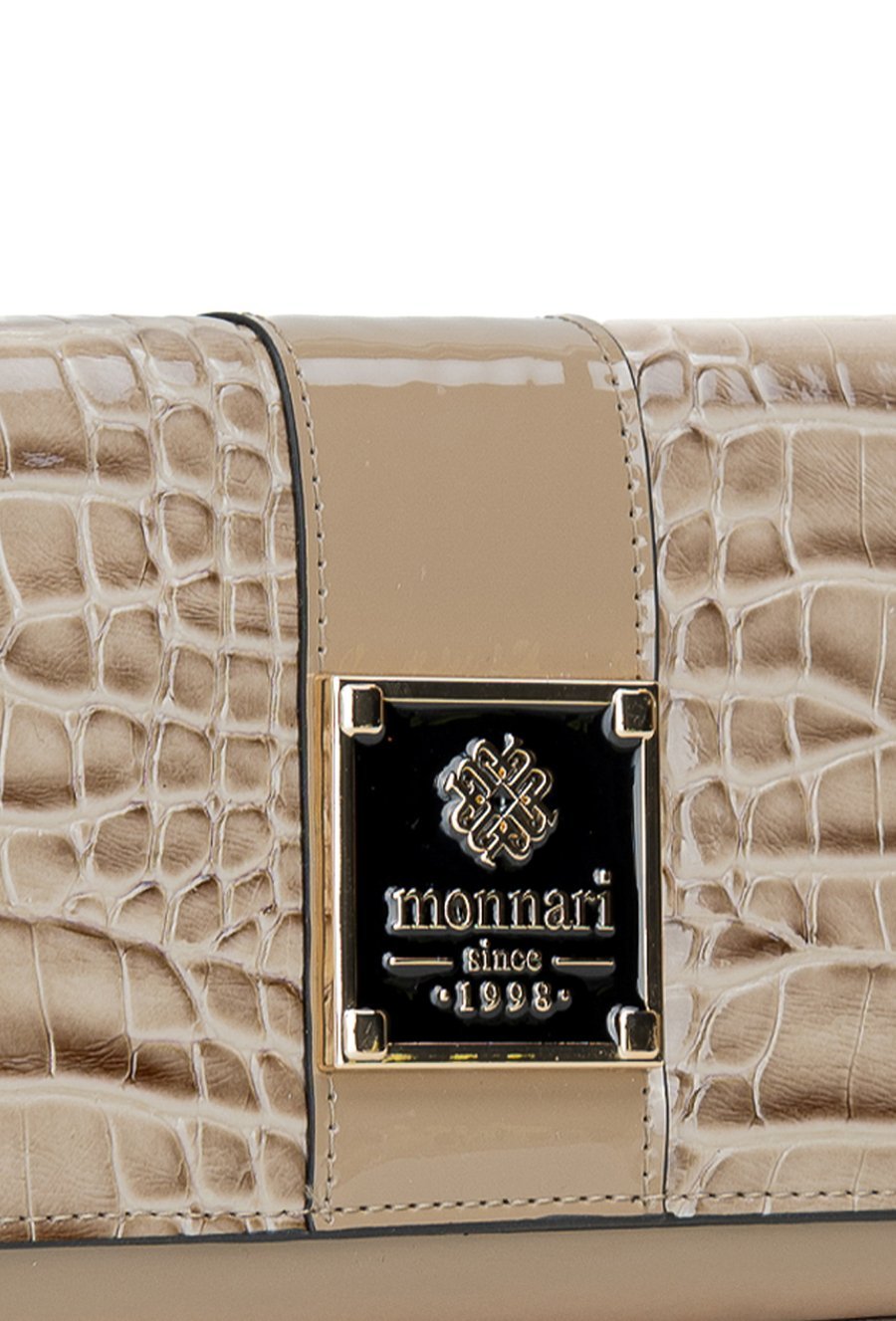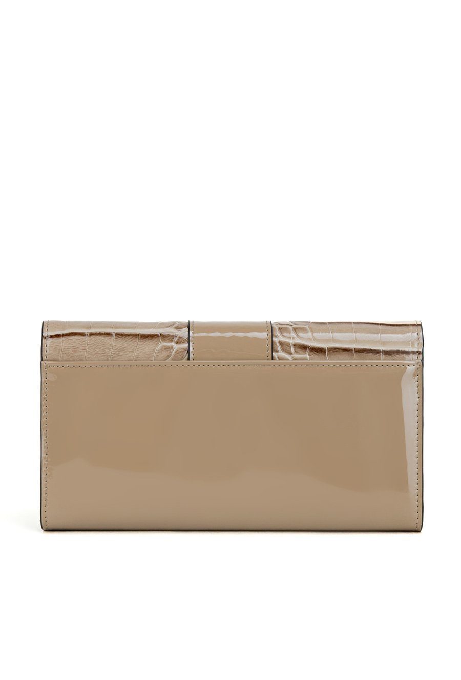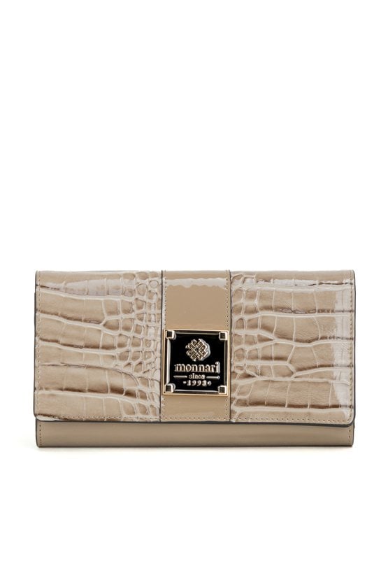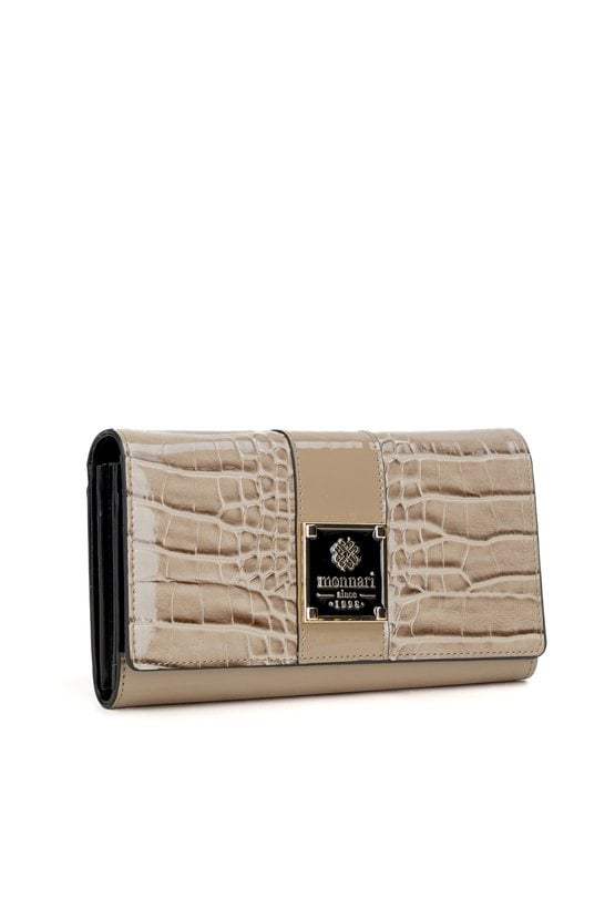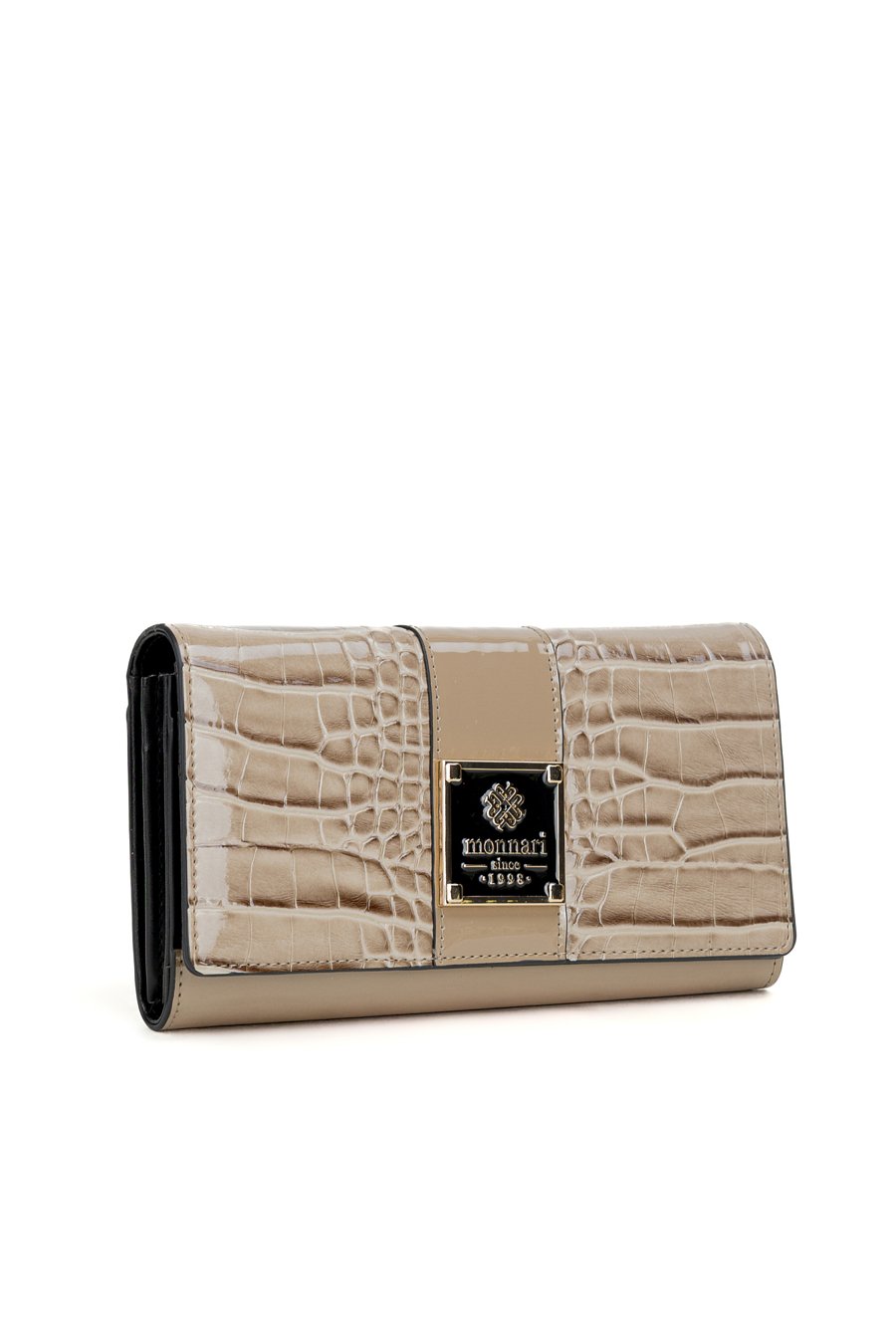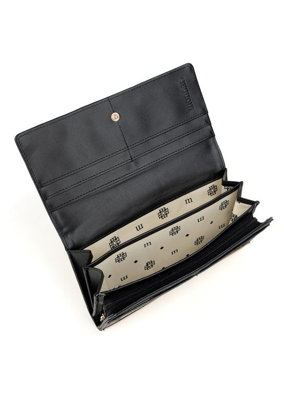 Portfel damski o wymiarach 19 x 10 x 3 cm. Posiada wiele kieszeni na banknoty i dokumenty, miejsce na zdjęcia oraz kieszonkę na monety zapinaną na suwak. Klapa z napą, ozdobiona złotym logo marki, dopełnia całości.