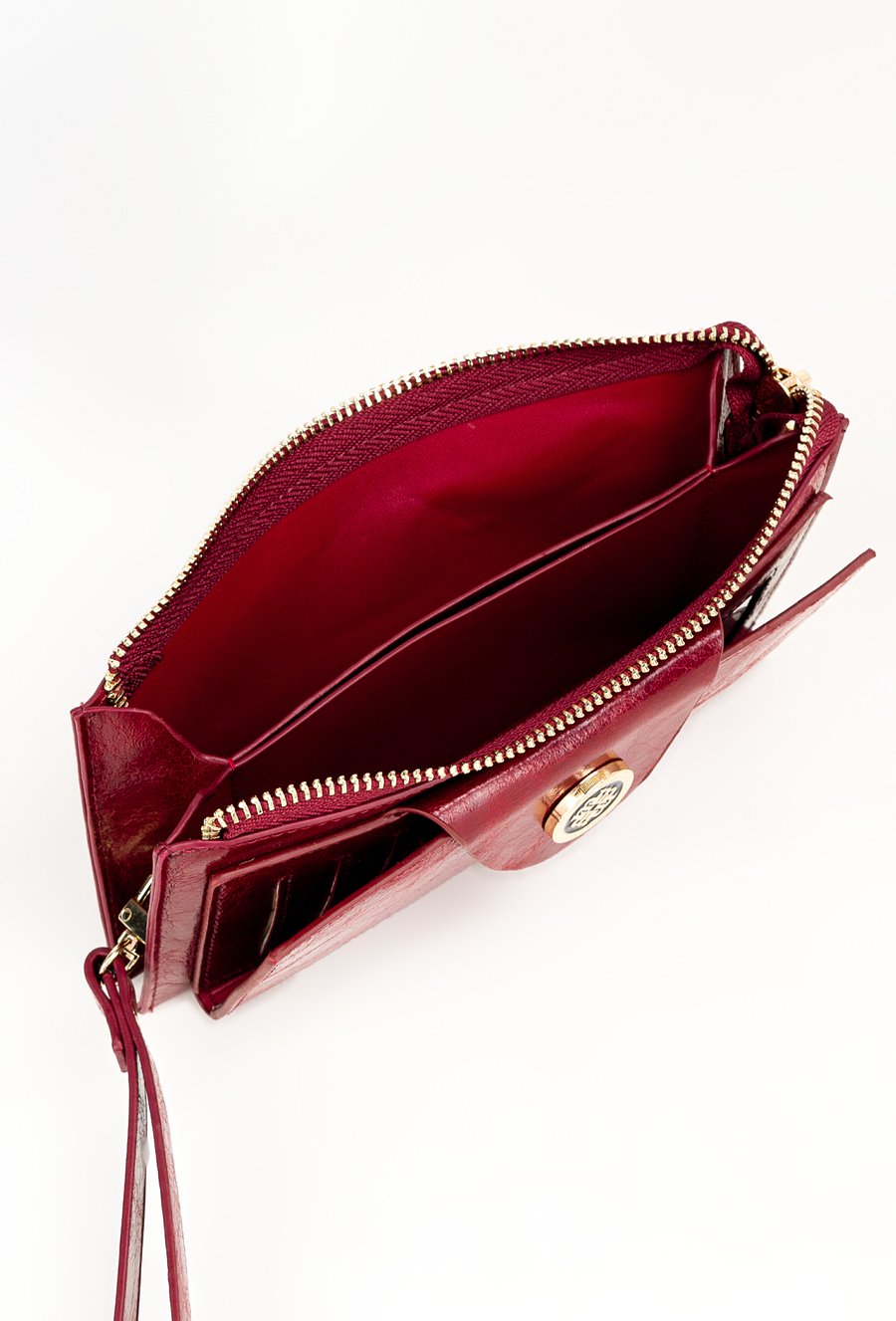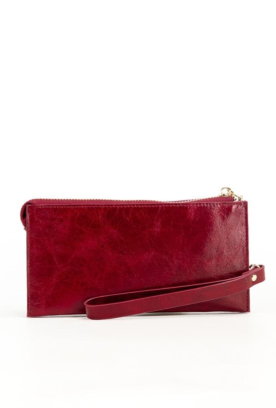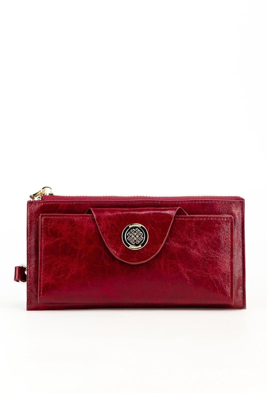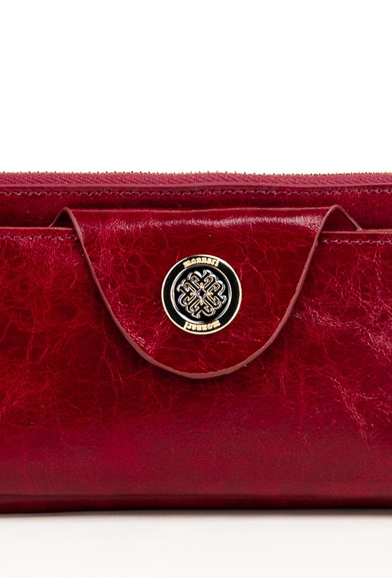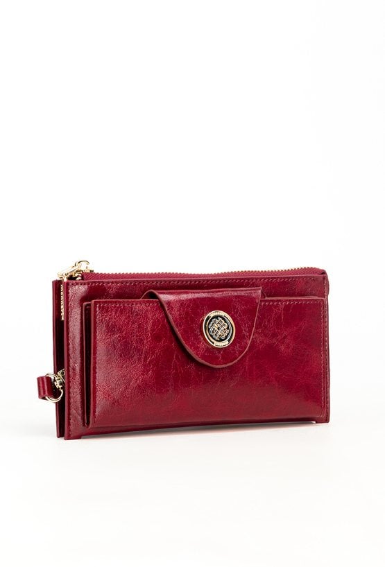 Portfel damski o wymiarach 19 x 9,5 x 3 cm. Posiada dużą kieszeń z dwoma komorami zapinaną na złoty suwak oraz drugą część zamykaną klapą z napą, ozdobioną złotym logo marki. Wewnątrz znajdują się przegródki na banknoty i miejsce na zdjęcia. Dodatkowym atutem jest dopinany, skórzany uchwyt.