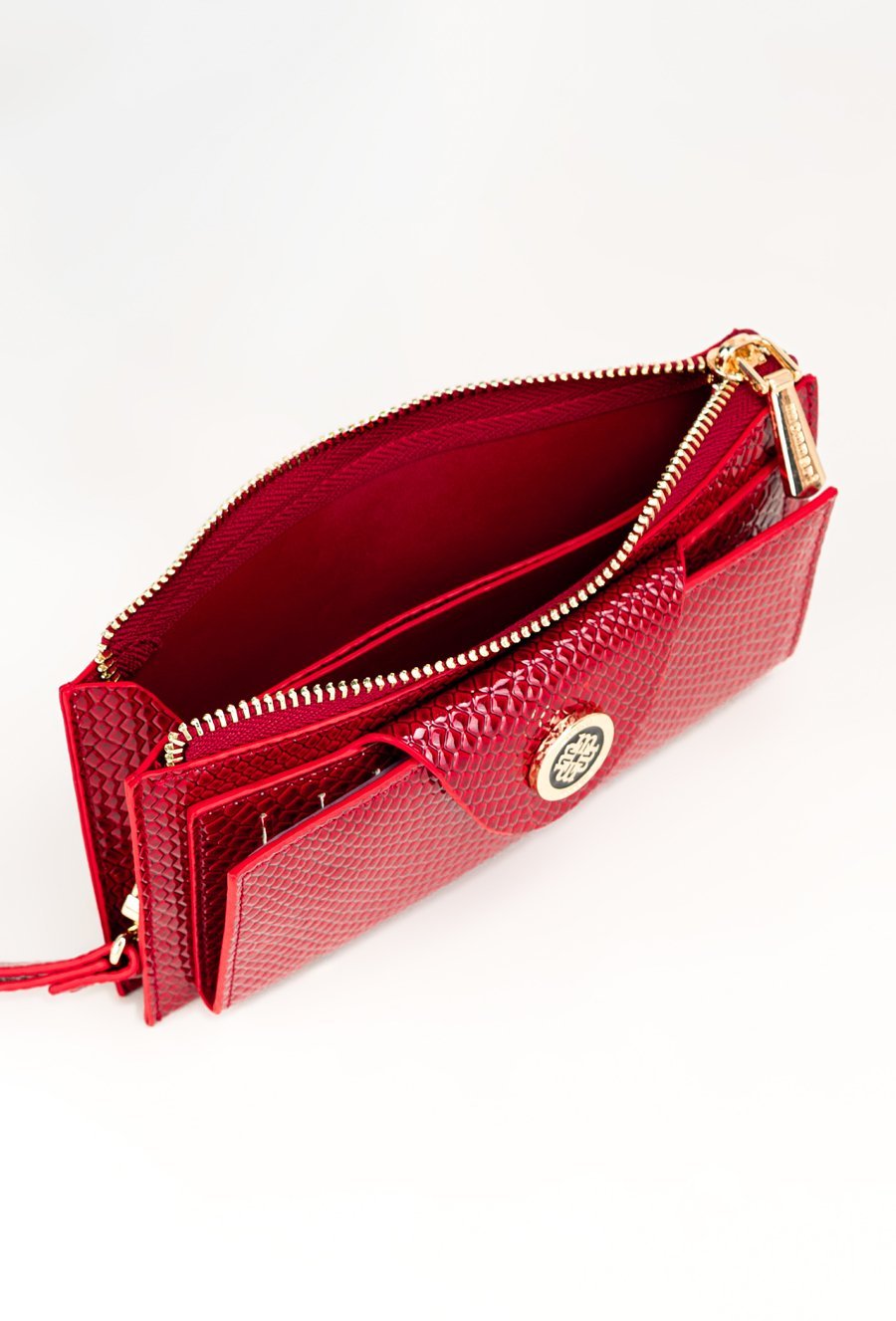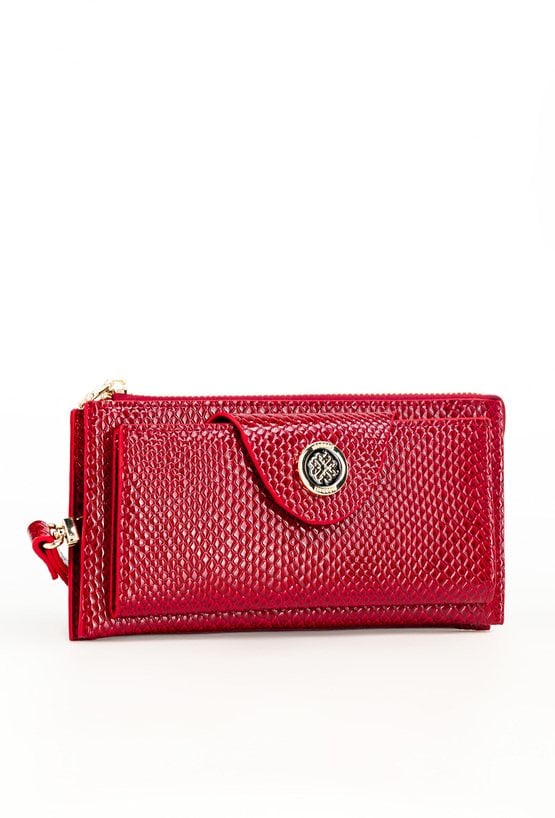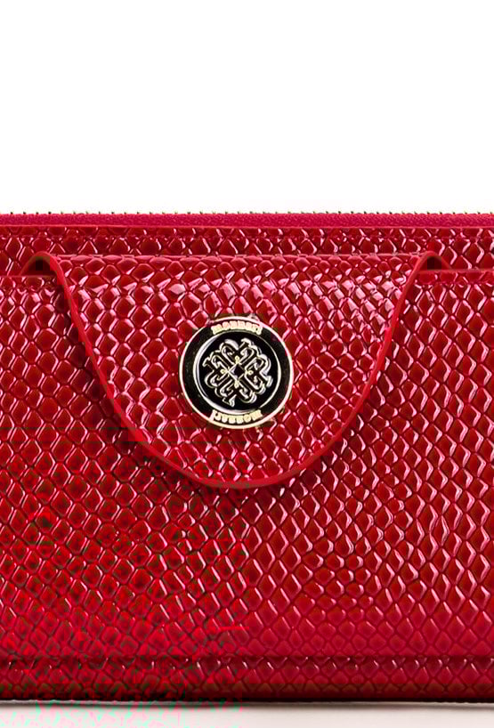 Portfel damski o wymiarach 19 x 9,5 x 3 cm. Posiada dużą kieszeń z dwoma komorami zapinaną na złoty suwak oraz drugą część zamykaną klapą z napą, ozdobioną złotym logo marki. Wewnątrz znajdują się przegródki na banknoty i miejsce na zdjęcia. Dodatkowym atutem jest dopinany, skórzany uchwyt.