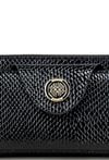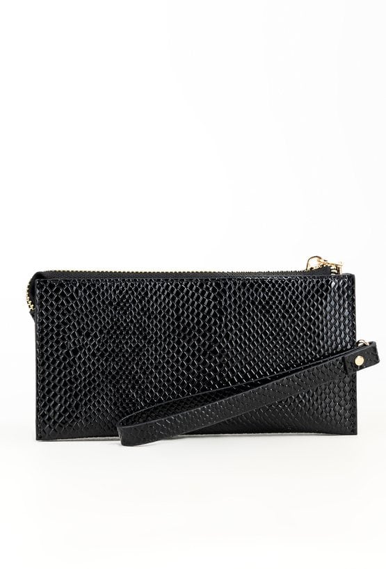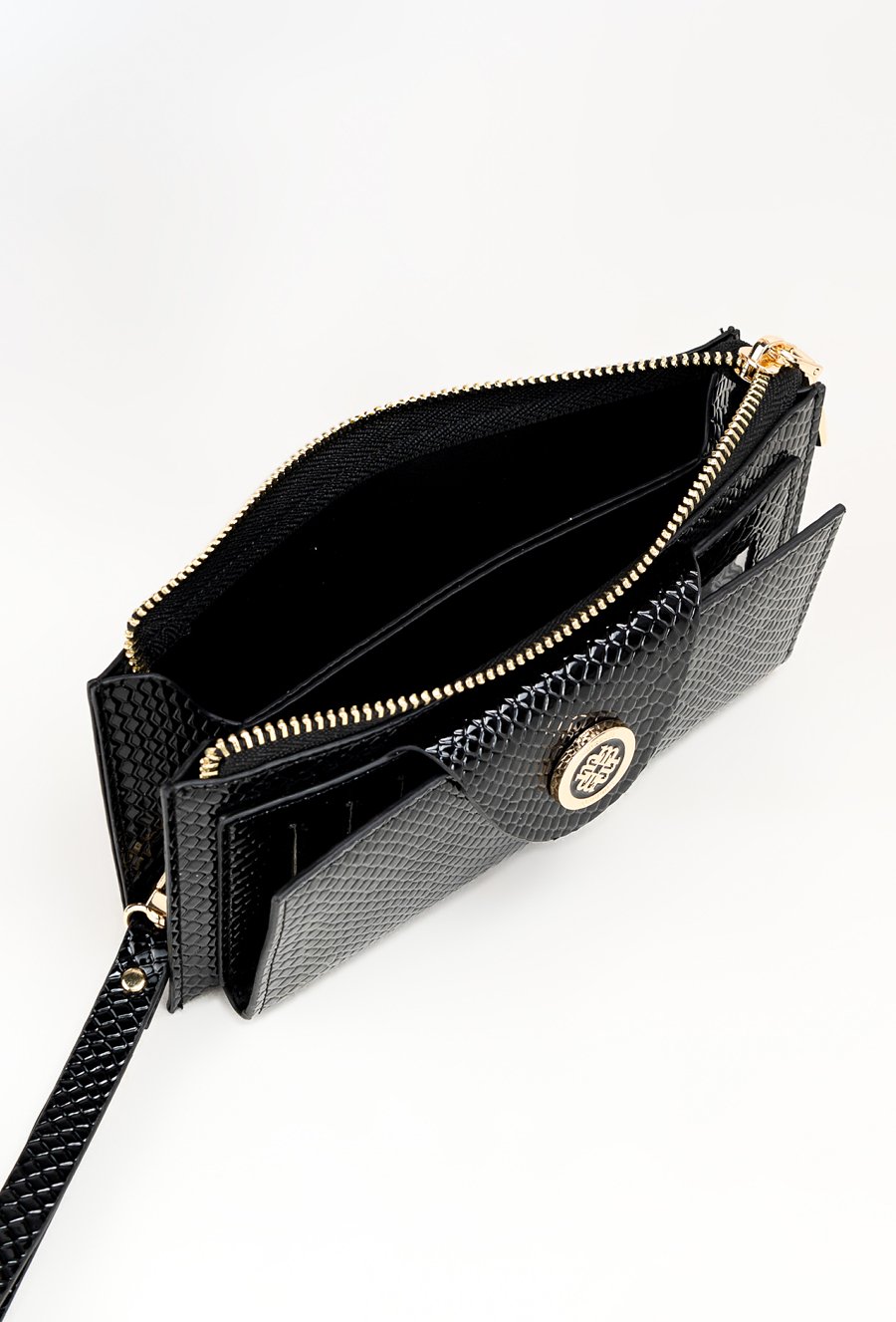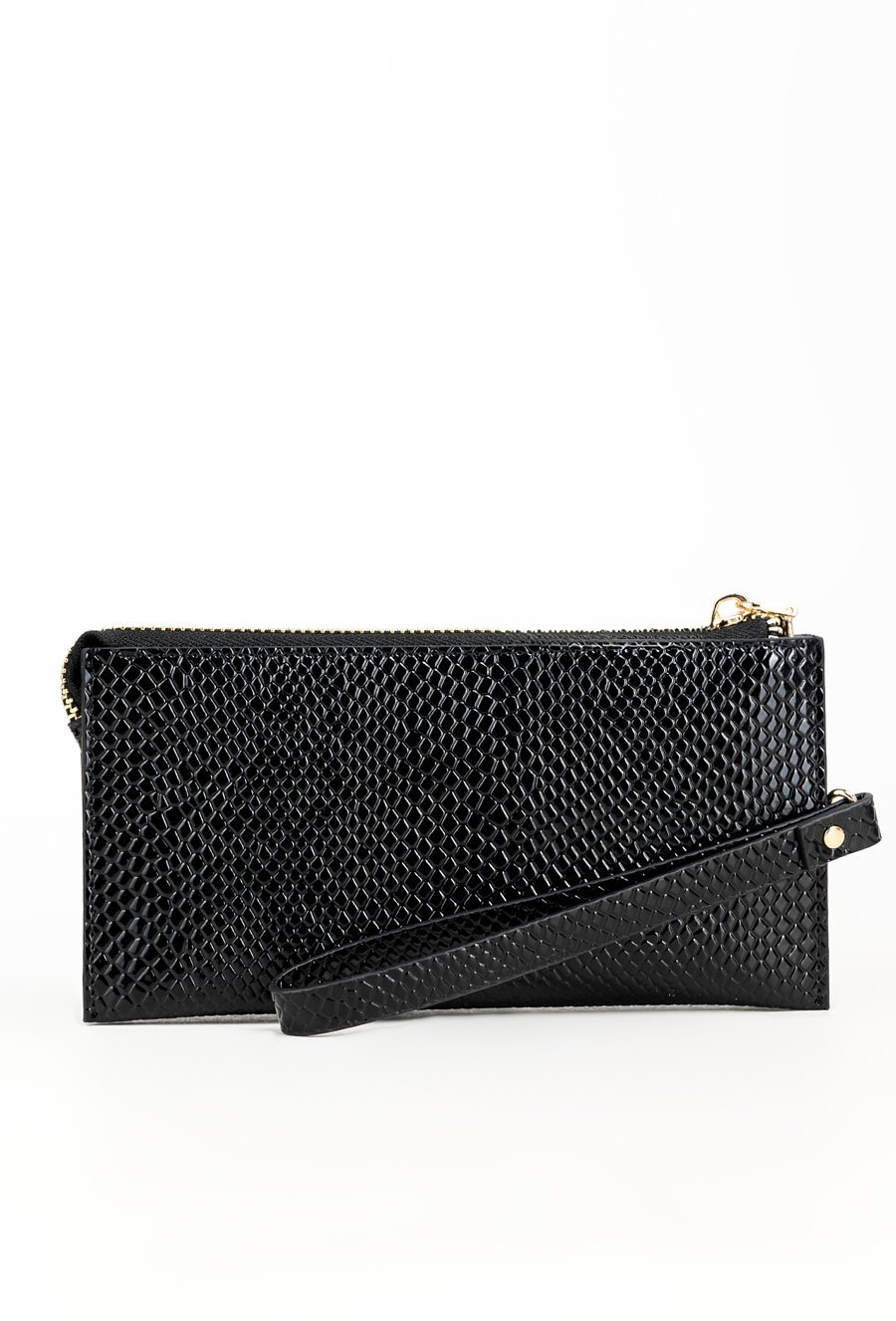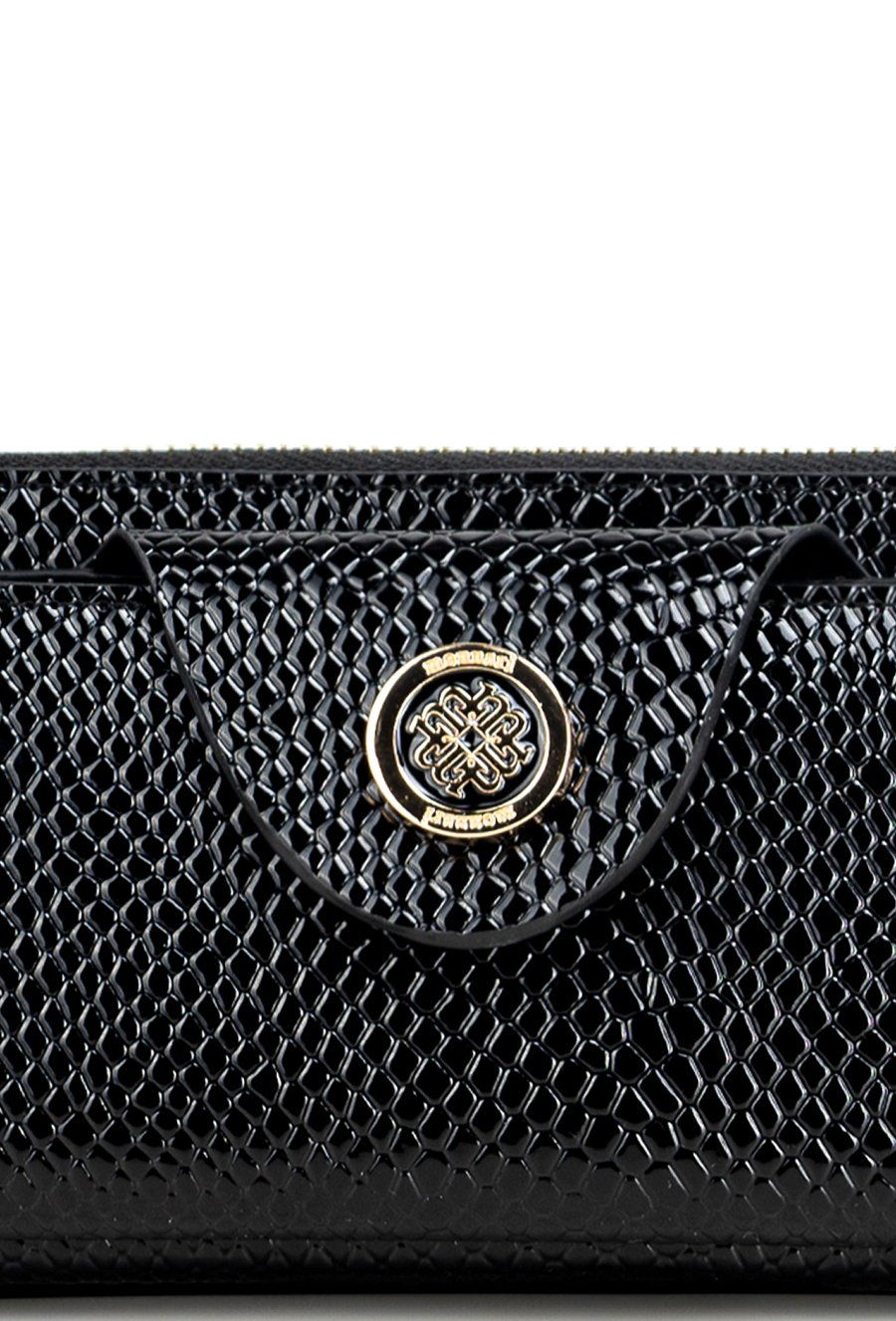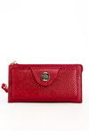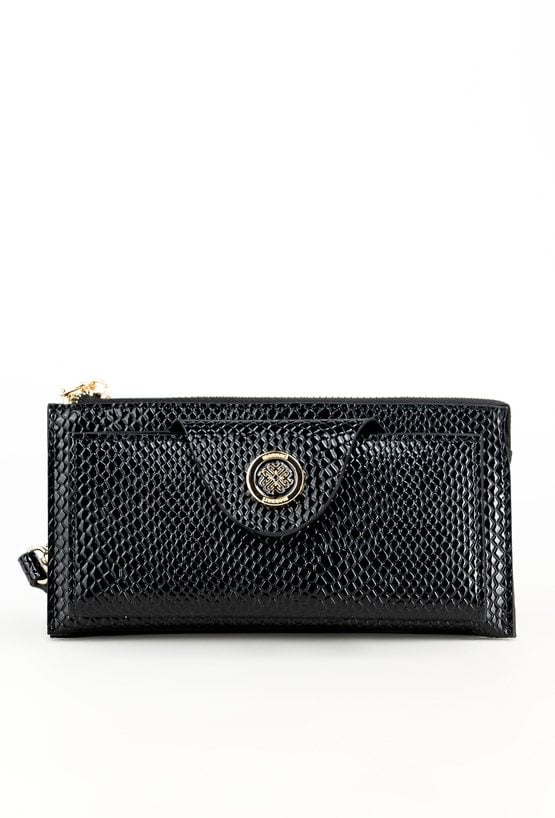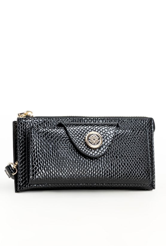 Portfel damski o wymiarach 19 x 9,5 x 3 cm. Posiada dużą kieszeń z dwoma komorami zapinaną na złoty suwak oraz drugą część zamykaną klapą z napą, ozdobioną złotym logo marki. Wewnątrz znajdują się przegródki na banknoty i miejsce na zdjęcia. Dodatkowym atutem jest dopinany, skórzany uchwyt.