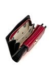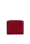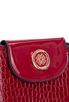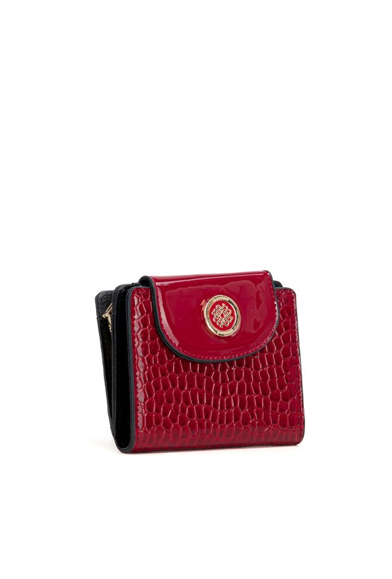 Portfel damski o wymiarach 11 x 8,5 x 3 cm. Posiada liczne przegródki na banknoty, miejsce na zdjęcia oraz kieszonkę zapinaną na złoty suwak. Całość zamykana klapą z napą, ozdobioną złotym logo marki.