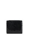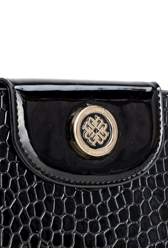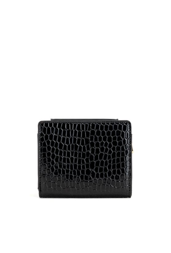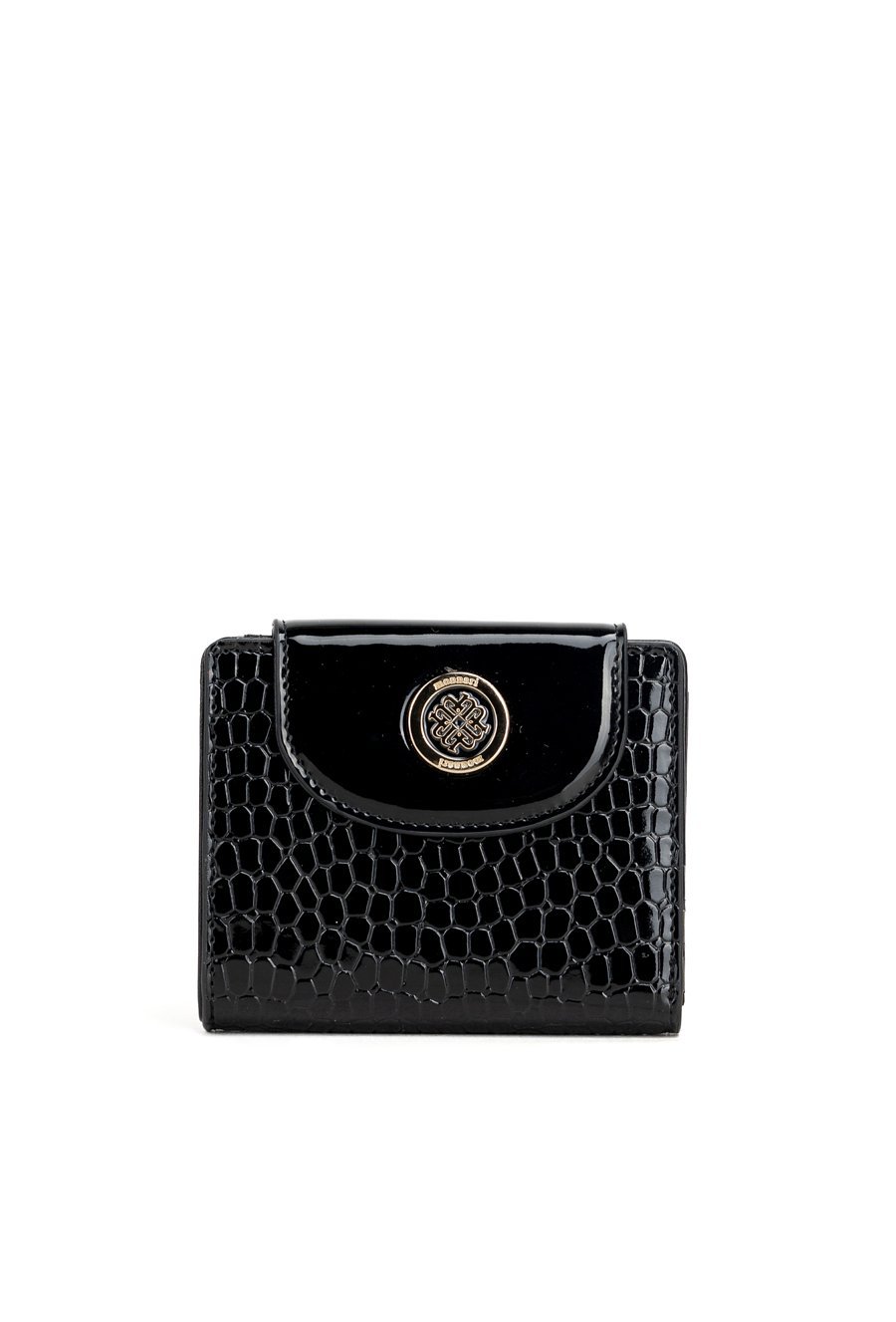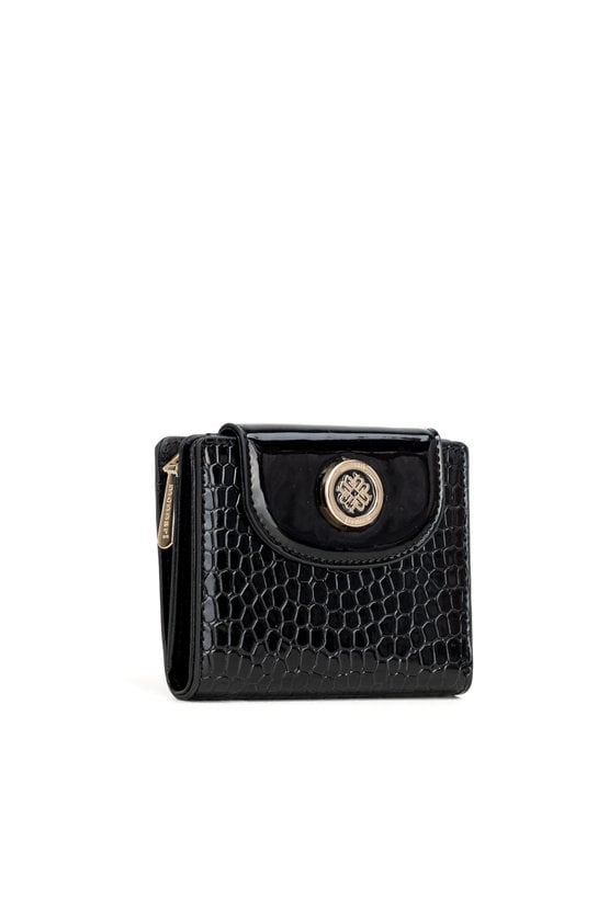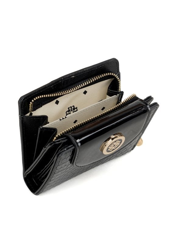 Portfel damski o wymiarach 11 x 8,5 x 3 cm. Posiada liczne przegródki na banknoty, miejsce na zdjęcia oraz kieszonkę zapinaną na złoty suwak. Całość zamykana klapą z napą, ozdobioną złotym logo marki.