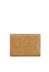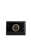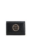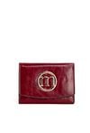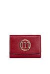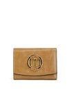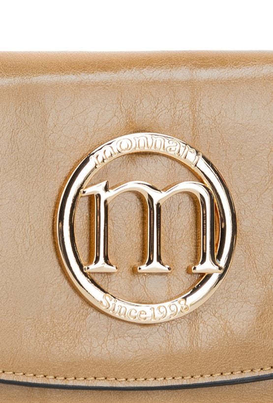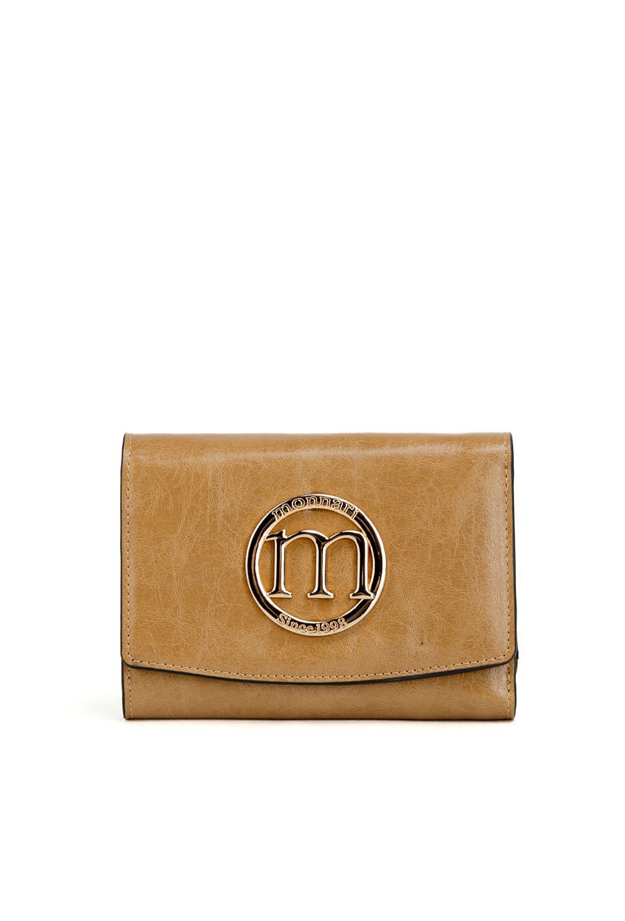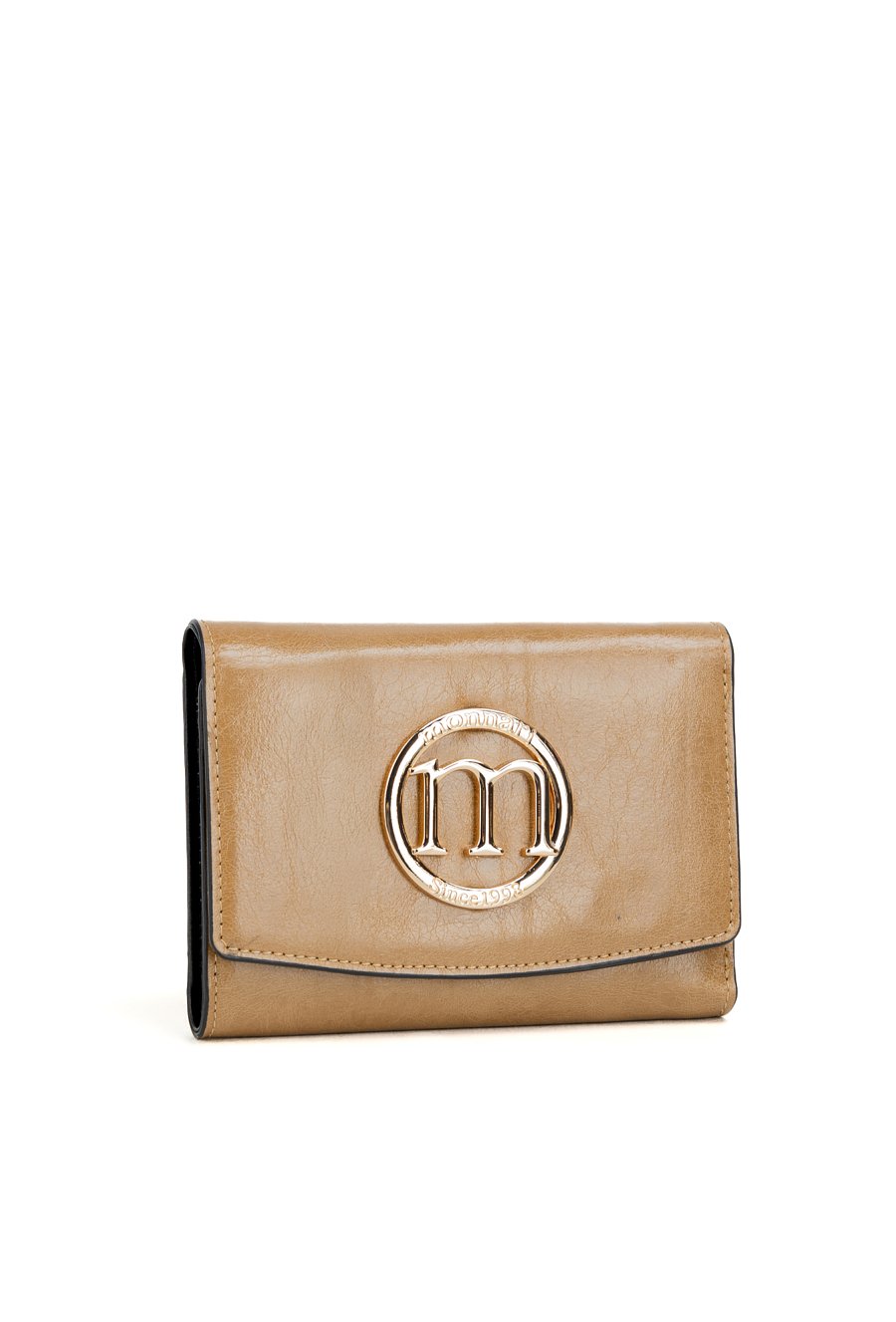 Portfel damski o wymiarach 14 x 10 x 3 cm. Wyposażony w liczne komory na banknoty, miejsce na zdjęcia oraz kieszonkę na monety zapinaną na suwak. Klapa z napą, zdobiona złotym logo marki, zapewnia eleganckie wykończenie.