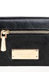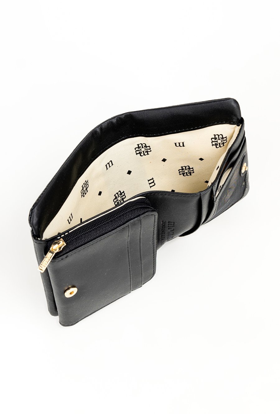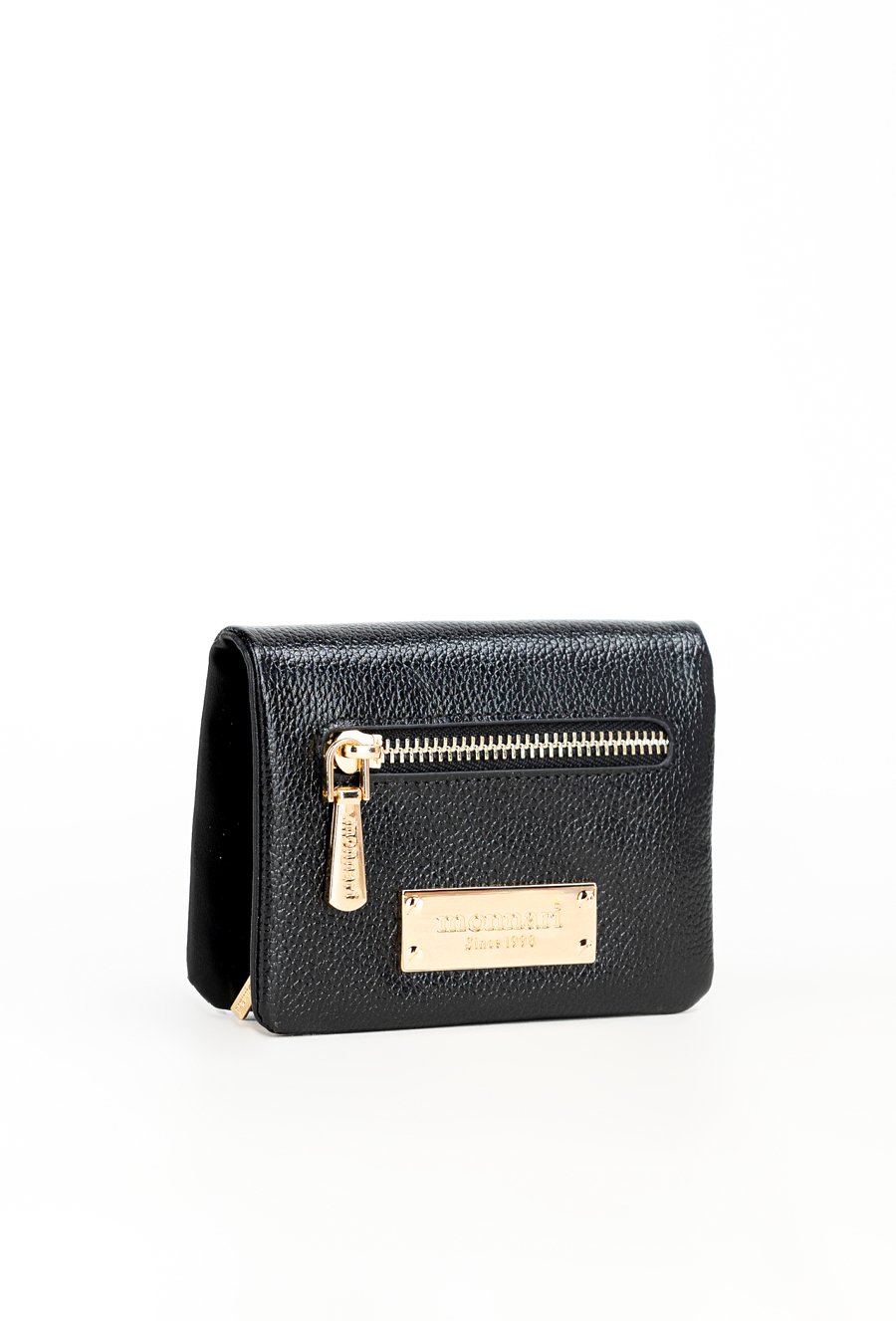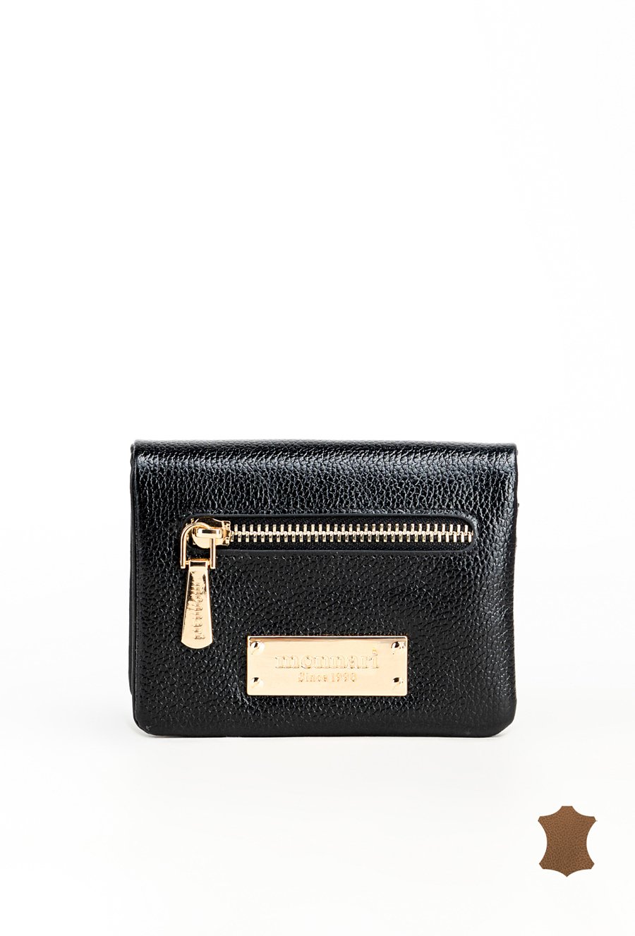Damski portfel o wymiarach 12,5 x 10 x 3 cm. Elegancki i funkcjonalny portfel damski zapinany na napę. Wnętrze kryje liczne przegrody na banknoty oraz specjalne miejsce na zdjęcia. Dodatkowo wyposażony jest w praktyczną kieszonkę na monety zapinaną na suwak. Z przodu znajduje się mała kieszonka ozdobiona stylowym, złotym suwakiem