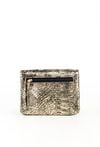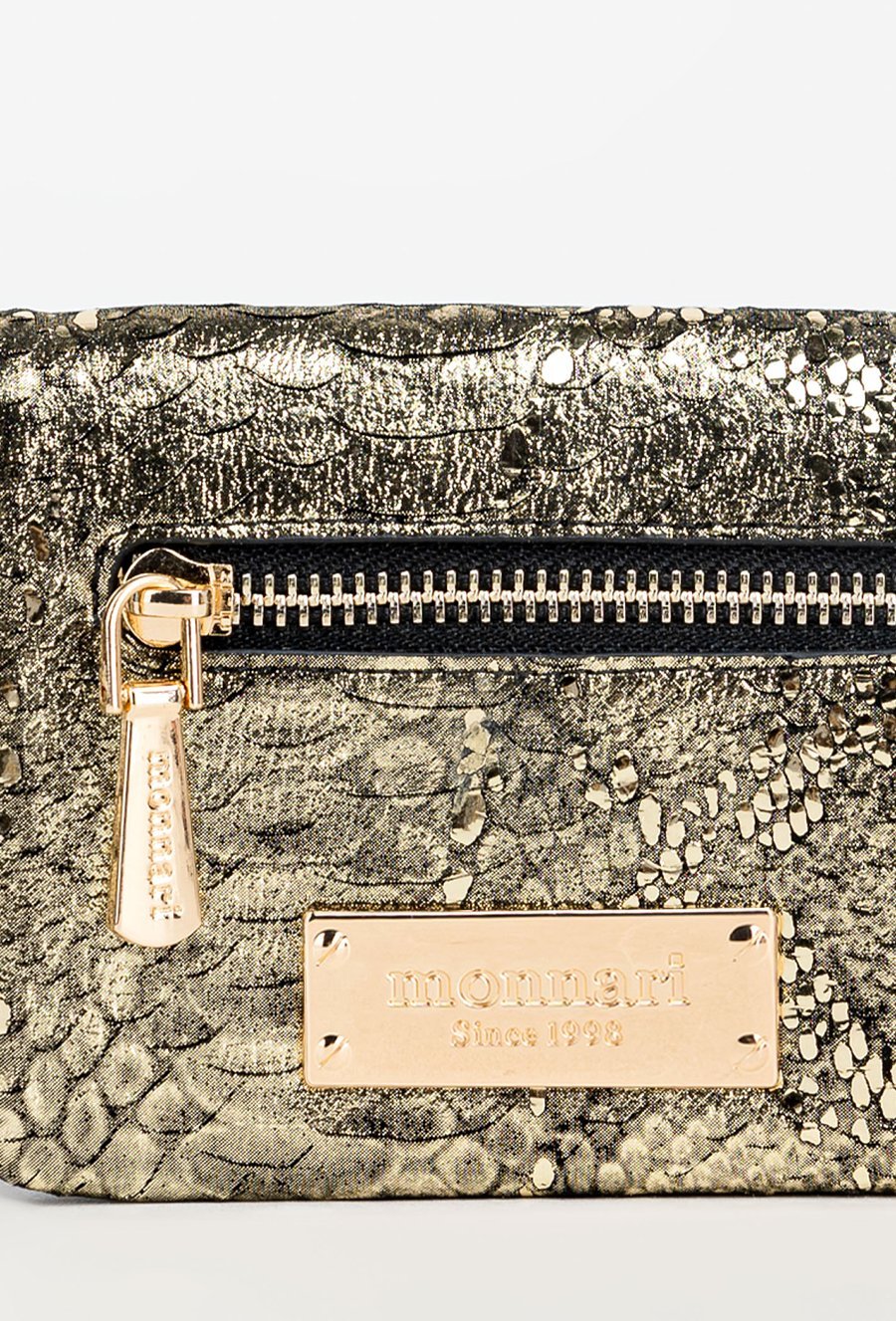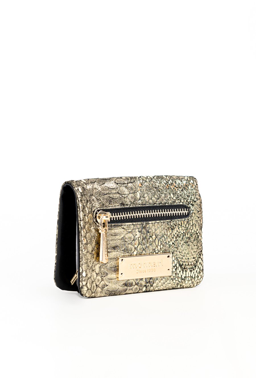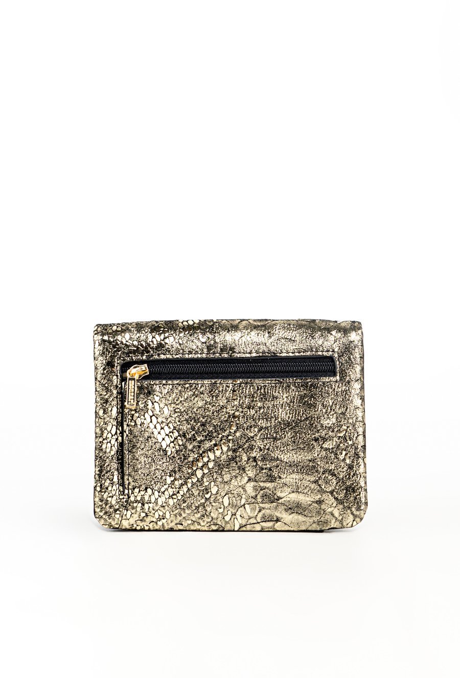 Damski portfel o wymiarach 12,5 x 10 x 3 cm. Elegancki i funkcjonalny portfel damski zapinany na napę. Wnętrze kryje liczne przegrody na banknoty oraz specjalne miejsce na zdjęcia. Dodatkowo wyposażony jest w praktyczną kieszonkę na monety zapinaną na suwak. Z przodu znajduje się mała kieszonka ozdobiona stylowym, złotym suwakiem