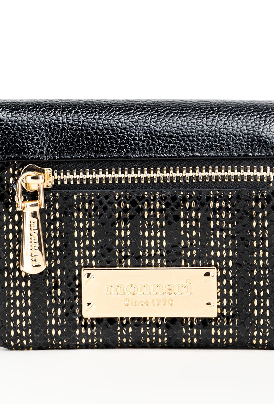 Damski portfel o wymiarach 12,5 x 10 x 3 cm. Elegancki i funkcjonalny portfel damski zapinany na napę. Wnętrze kryje liczne przegrody na banknoty oraz specjalne miejsce na zdjęcia. Dodatkowo wyposażony jest w praktyczną kieszonkę na monety zapinaną na suwak. Z przodu znajduje się mała kieszonka ozdobiona stylowym, złotym suwakiem