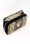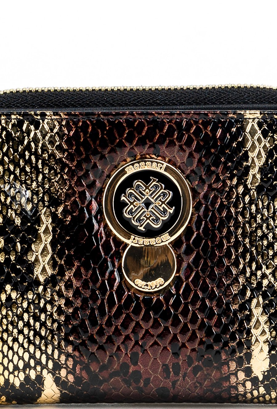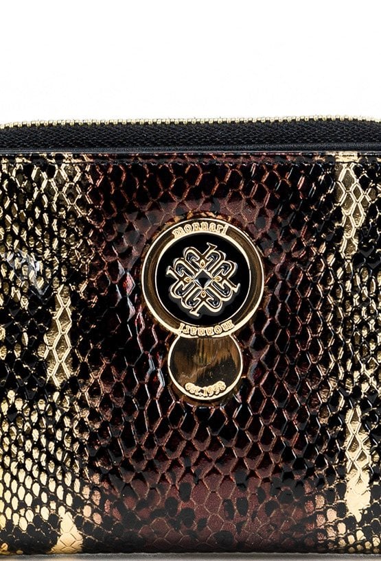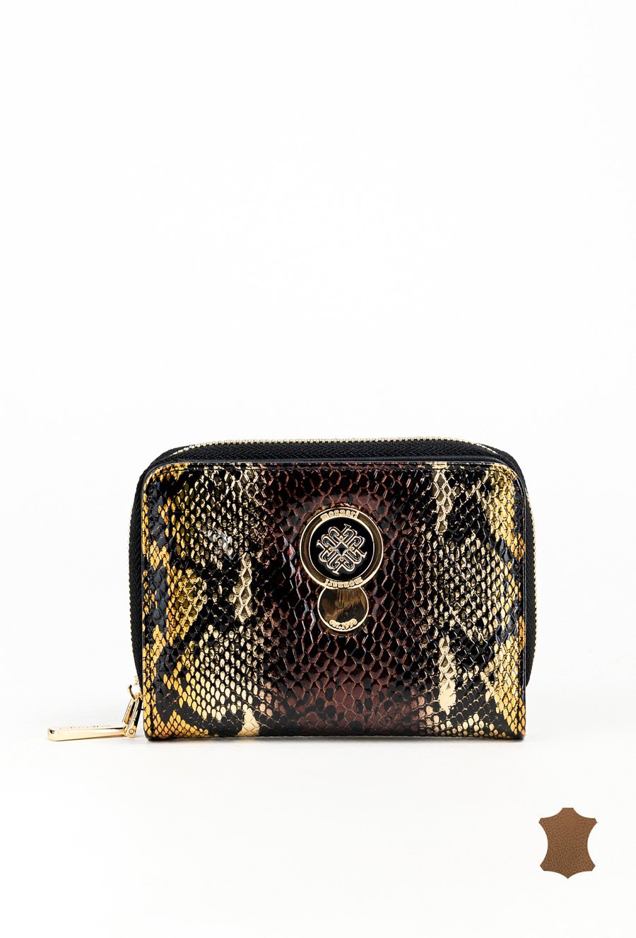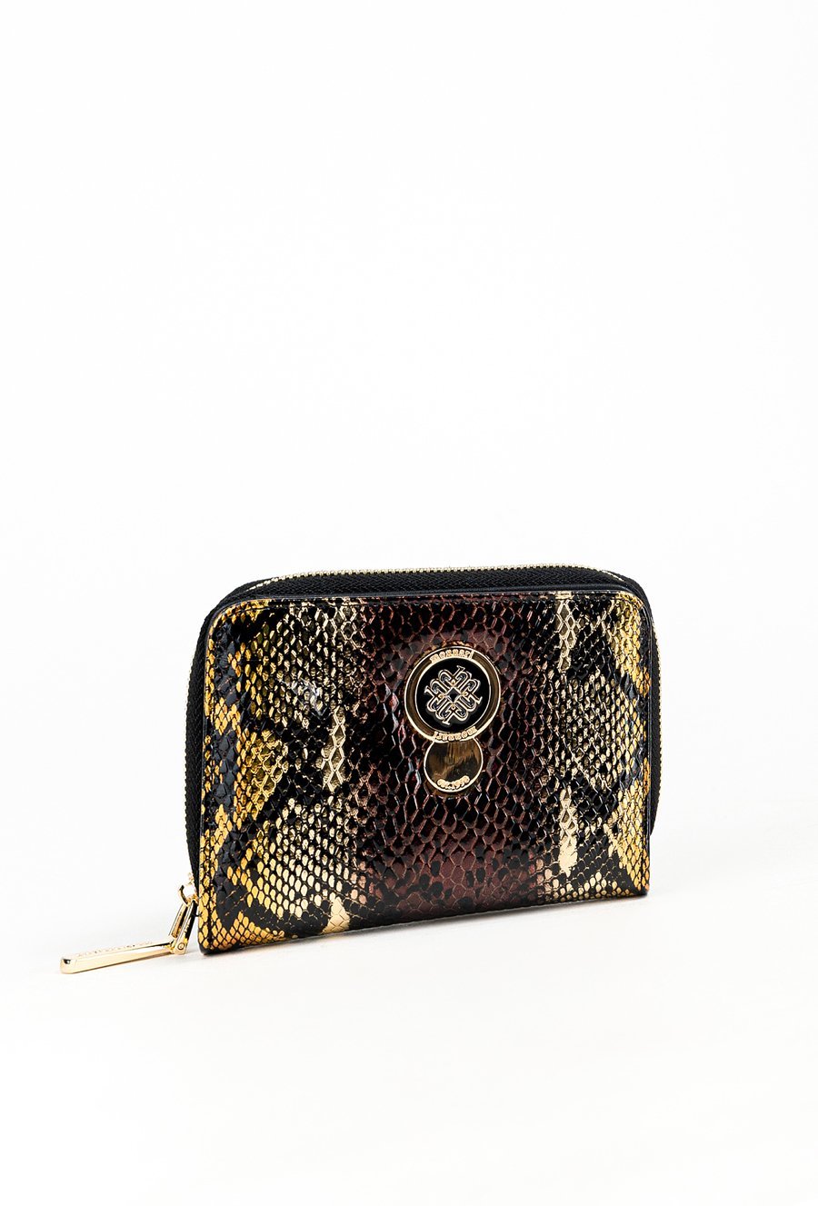 Damski portfel o wymiarach 13 x 9,5 x 2,5 cm. Posiada jedną komorę na monety zapinaną na suwak oraz osobną przegrodę zamykaną na napę, w której znajdują się kieszonki na karty, miejsce na banknoty oraz przeźroczysta kieszonka na zdjęcie. Przód portfela zdobi eleganckie logo marki.