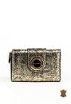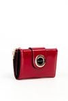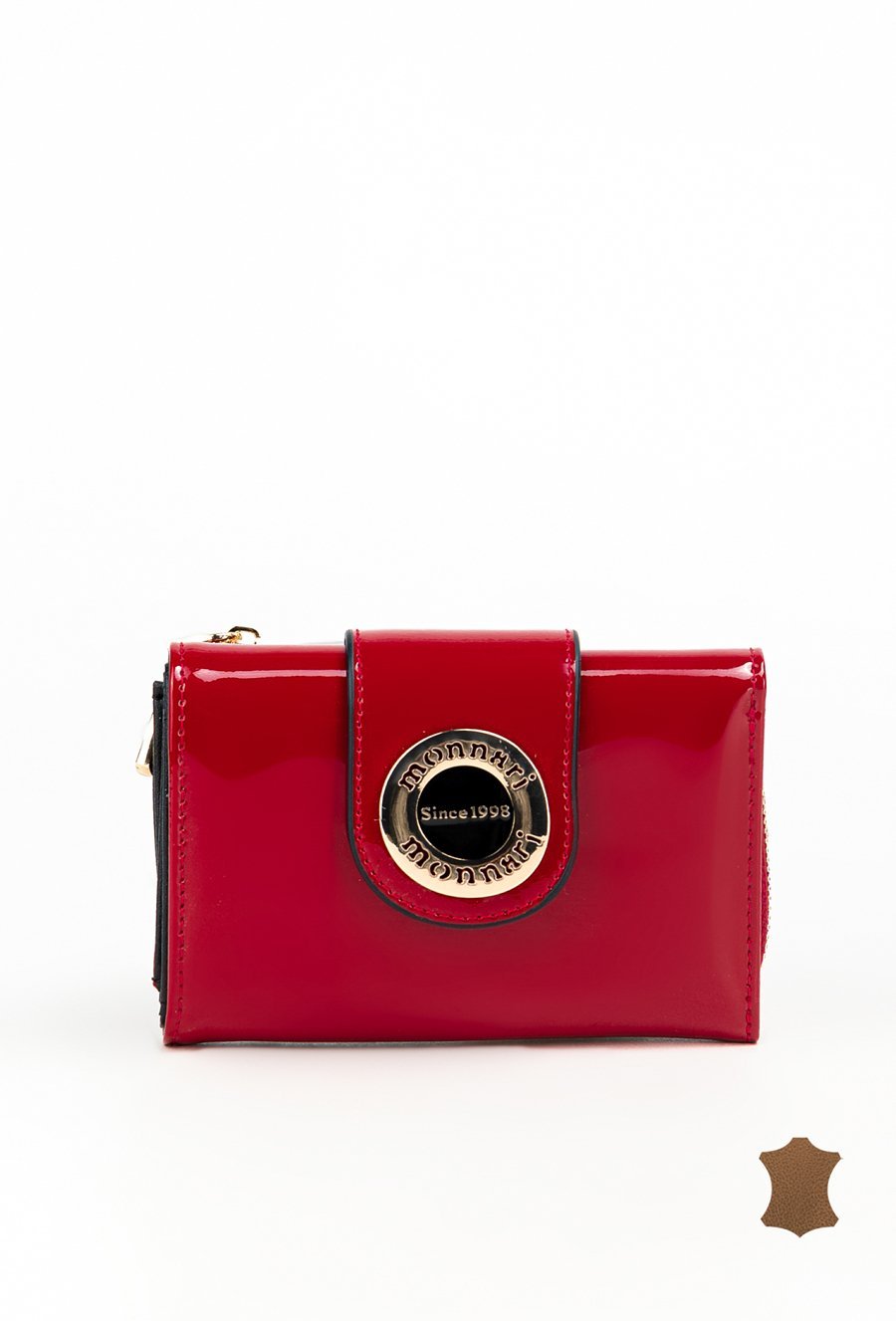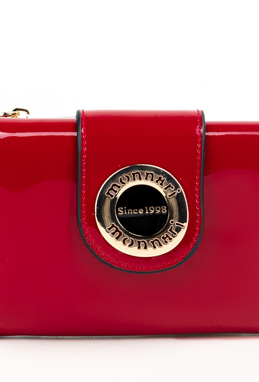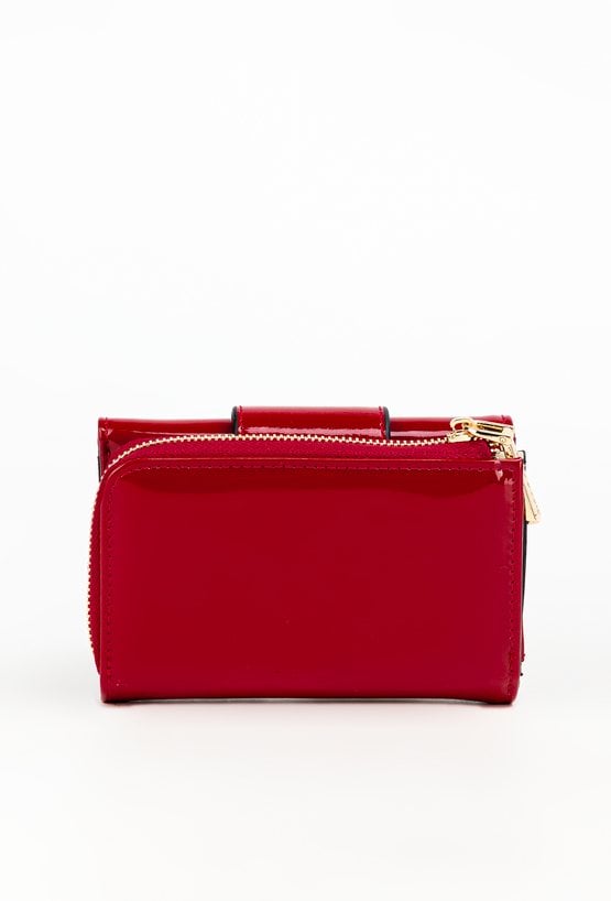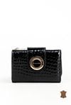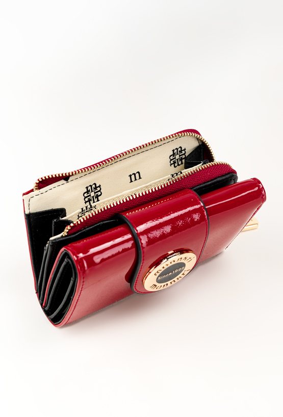 Damski portfel o wymiarach 12 x 8 x 3 cm. Wyposażony w kieszonkę na monety zapinaną na suwak, podzieloną na dwie oddzielne komory. Dodatkowa część portfela, zamykana klapką na napę zdobioną logo marki, skrywa miejsce na banknoty, karty oraz przezroczystą kieszonkę na zdjęcie.