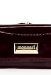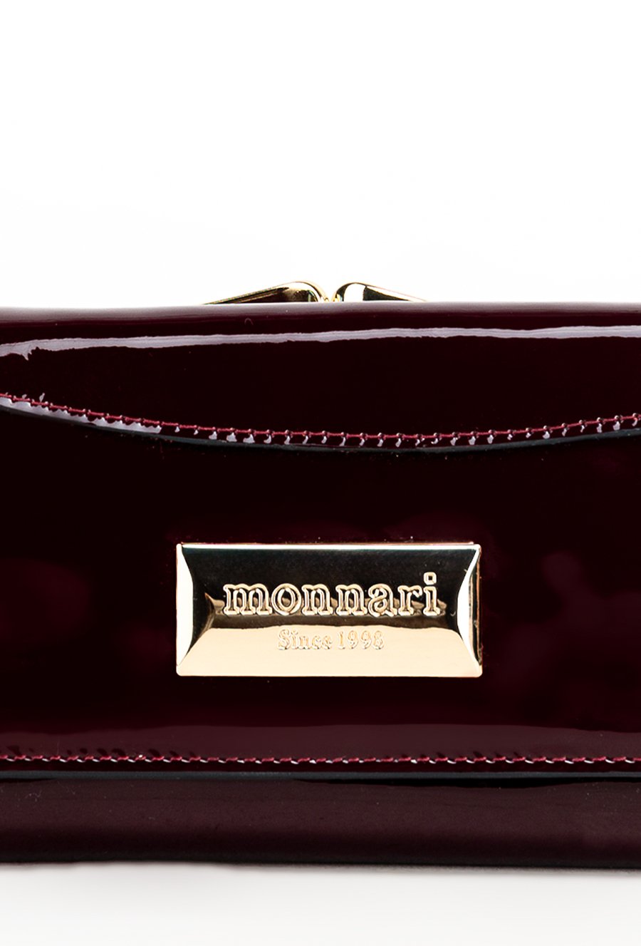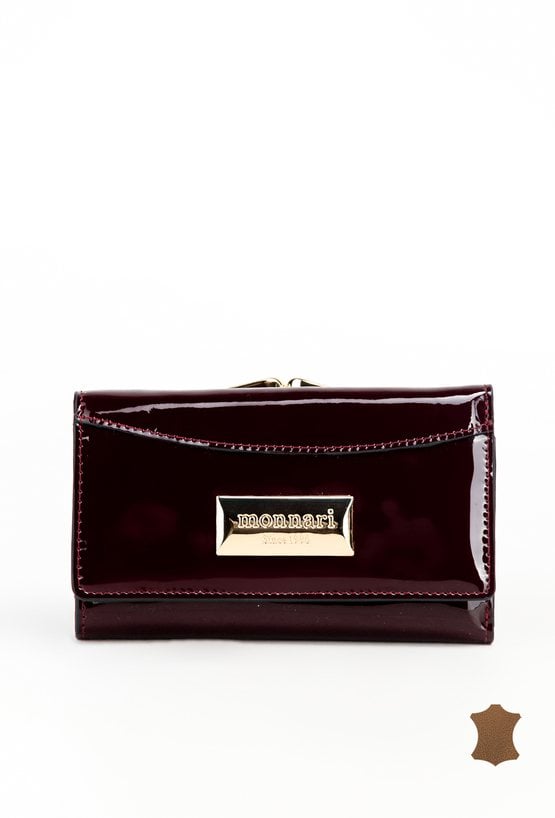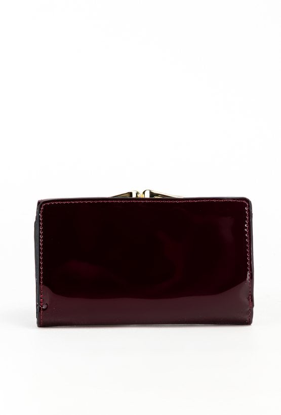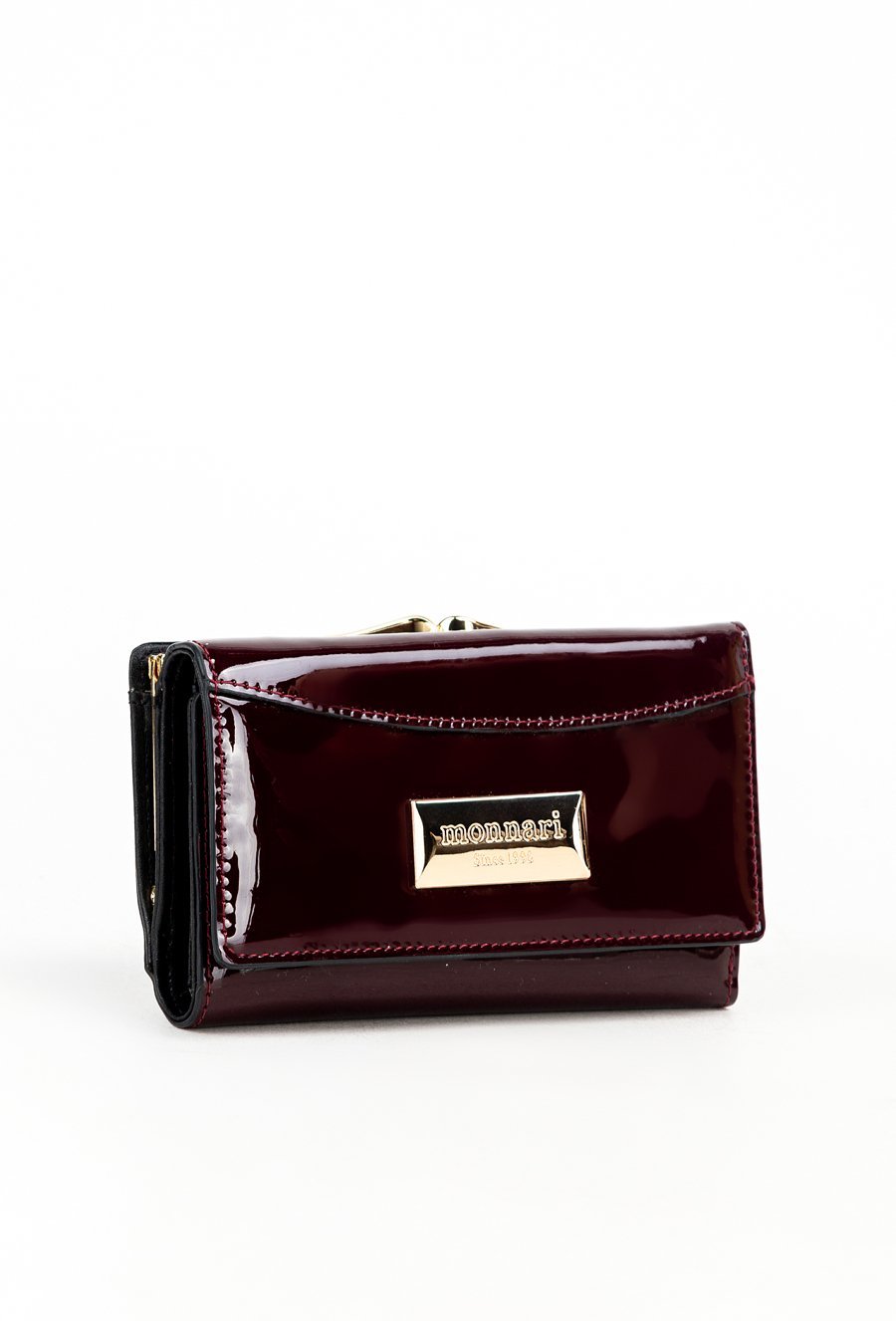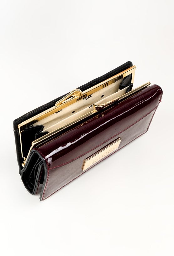 Portfel damski o wymiarach 14 x 8 x 3,5 cm. Wyposażony w praktyczną kieszonkę na monety, podzieloną na dwie komory i zamykaną na zatrzask. Główna część portfela zapinana jest na napę i ozdobiona złotym logo marki. Wewnątrz znajdują się liczne kieszonki na karty, przegroda na banknoty oraz specjalne miejsce na zdjęcie.