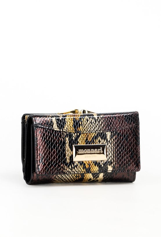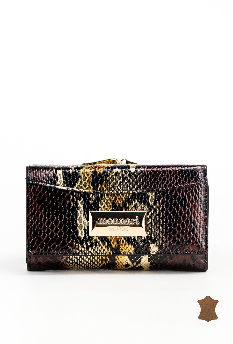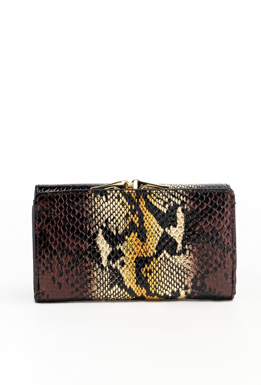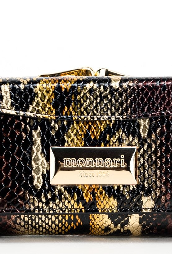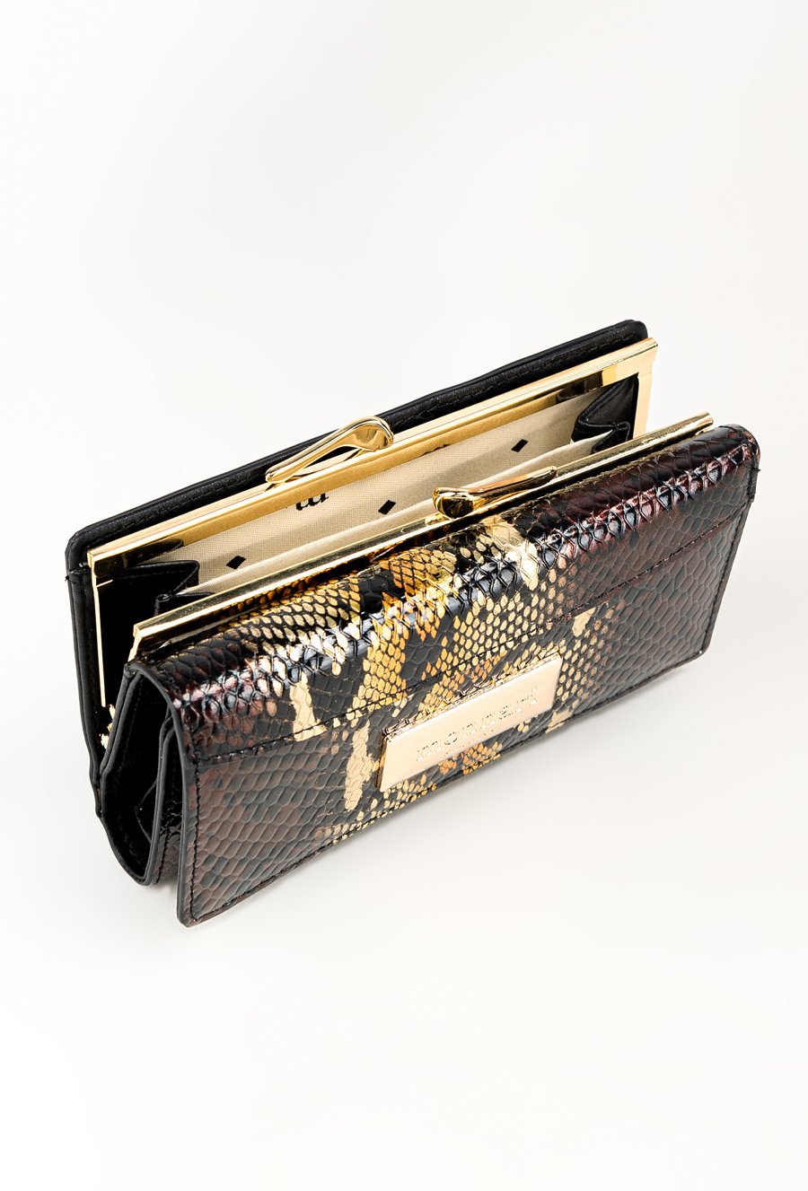 Portfel damski o wymiarach 14 x 8 x 3,5 cm. Wyposażony w praktyczną kieszonkę na monety, podzieloną na dwie komory i zamykaną na zatrzask. Główna część portfela zapinana jest na napę i ozdobiona złotym logo marki. Wewnątrz znajdują się liczne kieszonki na karty, przegroda na banknoty oraz specjalne miejsce na zdjęcie.