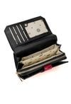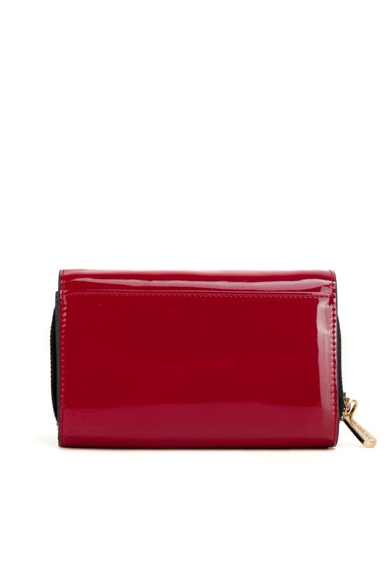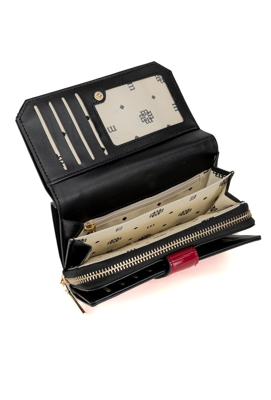 Portfel damski o wymiarach 16 cm x 10 cm x 4 cm, z klapą zapinaną na napę. Wnętrze portfela oferuje liczne przegródki oraz miejsca na karty i banknoty, a także kieszonkę zapinaną na suwak. Dodatkowym atutem jest miejsce na zdjęcie.